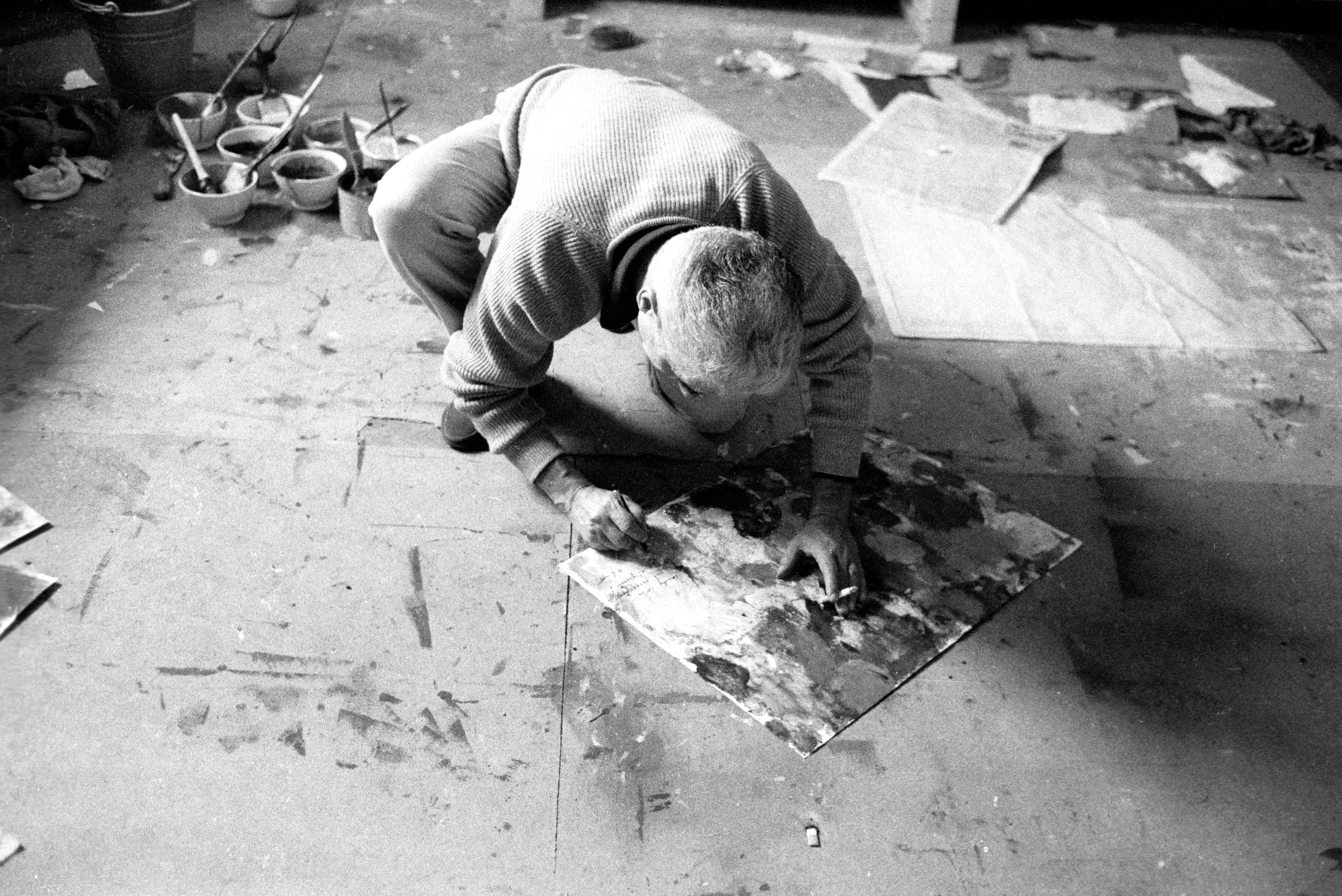 Black and white photograph looking down on a man crouched over a paint-marked canvas on a studio floor, working with a small tool