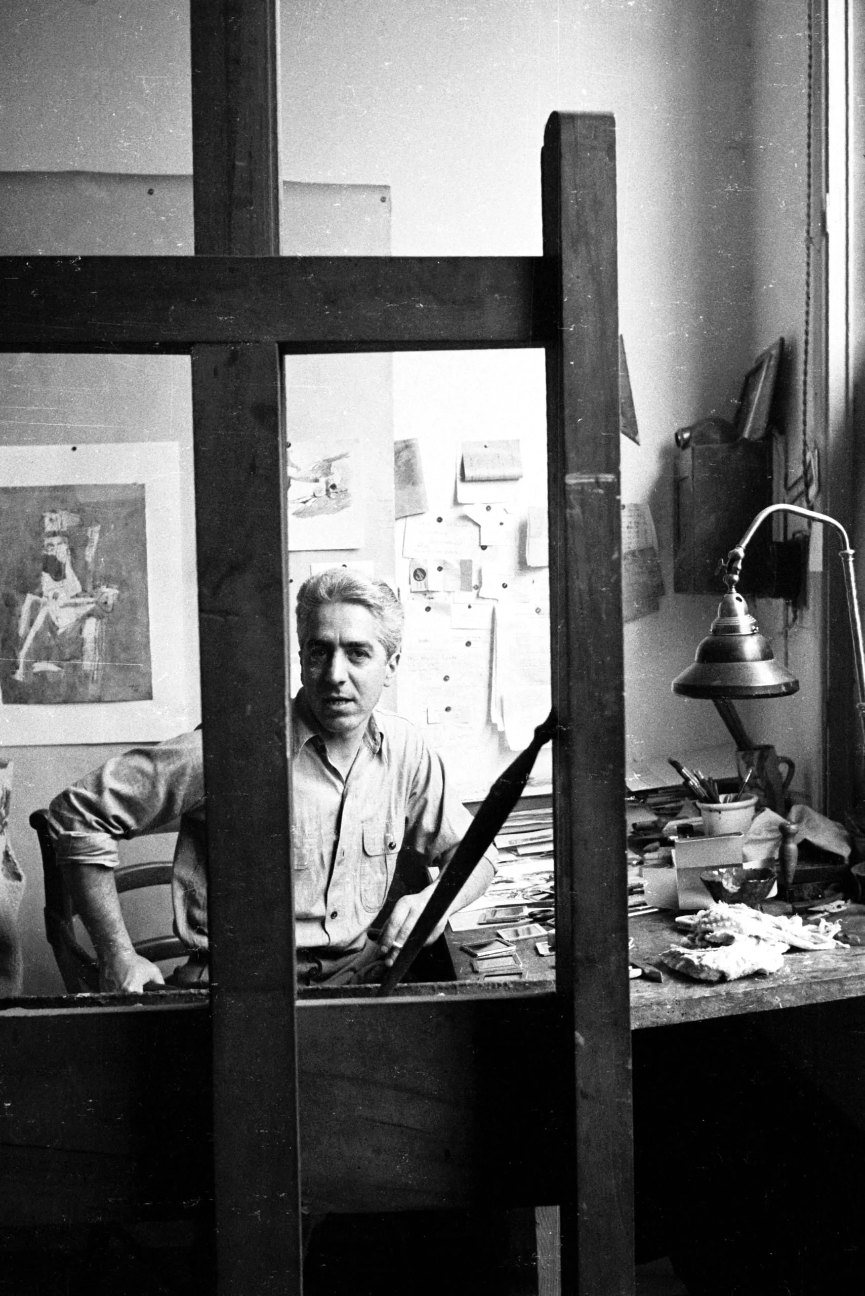 Black and white photograph of a man with short dark hair seated in a cluttered studio, viewed through the beams of a large wooden easel, with artwork and a desk lamp visible behind him