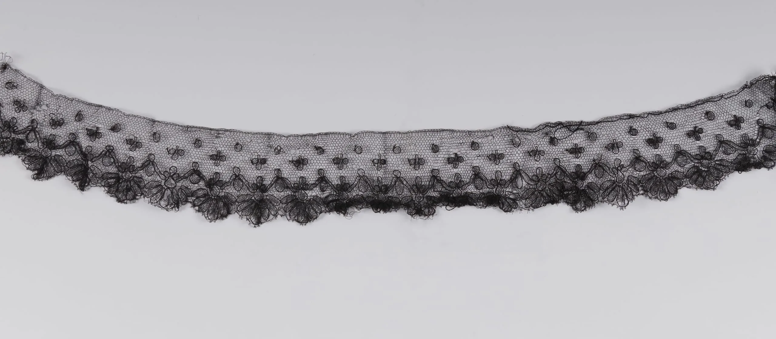 Narrow strip of black lace with dot-patterned net ground and scalloped floral border along the lower edge, draped in a gentle arc against a gray background