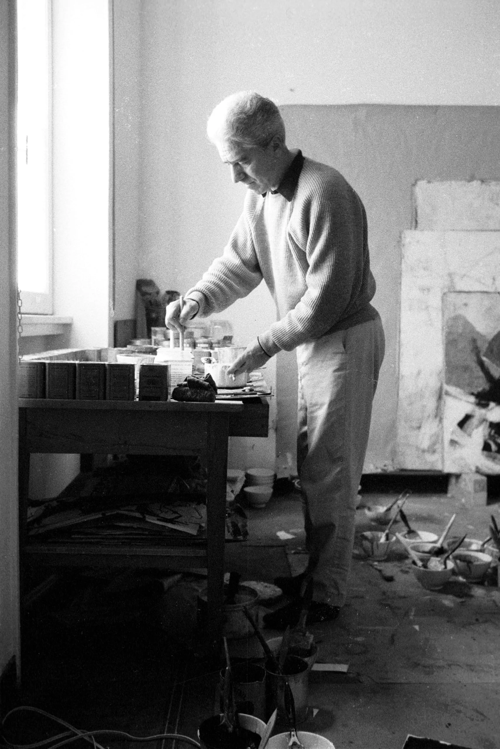 Black and white photograph of a gray-haired man in a ribbed sweater leaning over a worktable cluttered with jars and art supplies in a messy studio