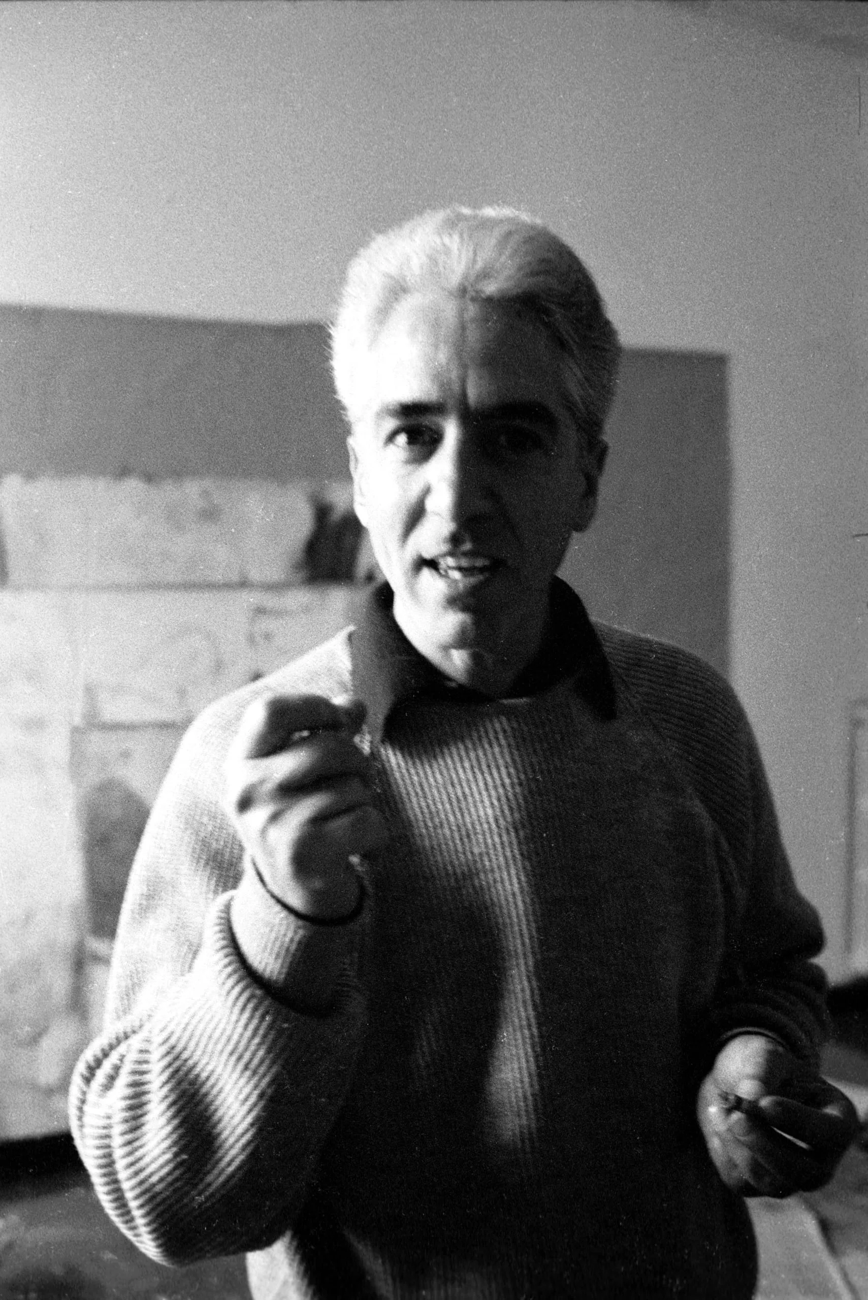 Black and white photograph of a white man with white hair, mid-gesture, wearing a ribbed sweater, with a large canvas visible behind him