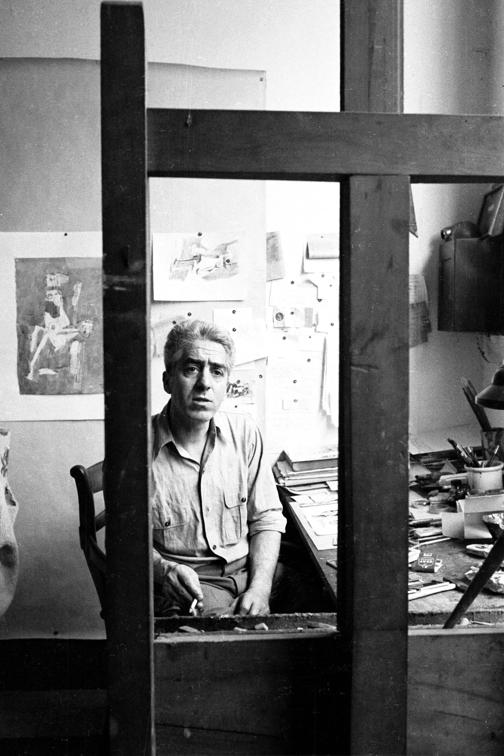 Black and white photograph of a man seated at a cluttered studio worktable, framed by a large wooden structure, with artwork pinned to the wall behind him
