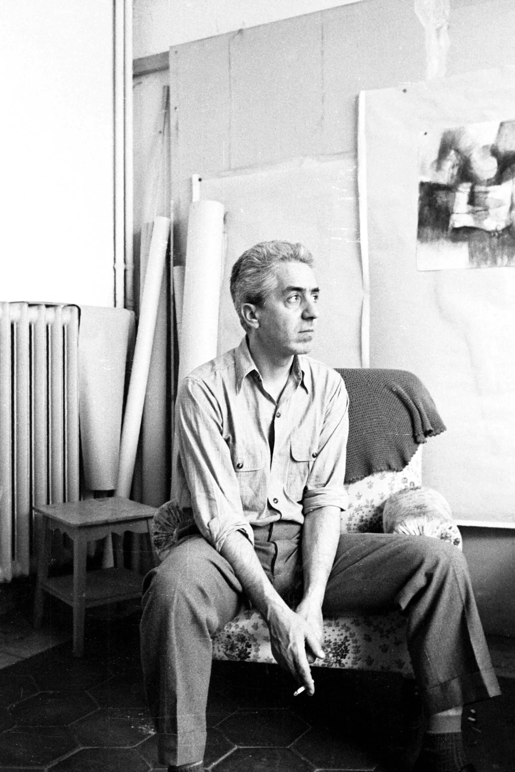 Black and white photograph of a white man seated on a floral sofa in an artist's studio, leaning forward with a cigarette, gazing to the left