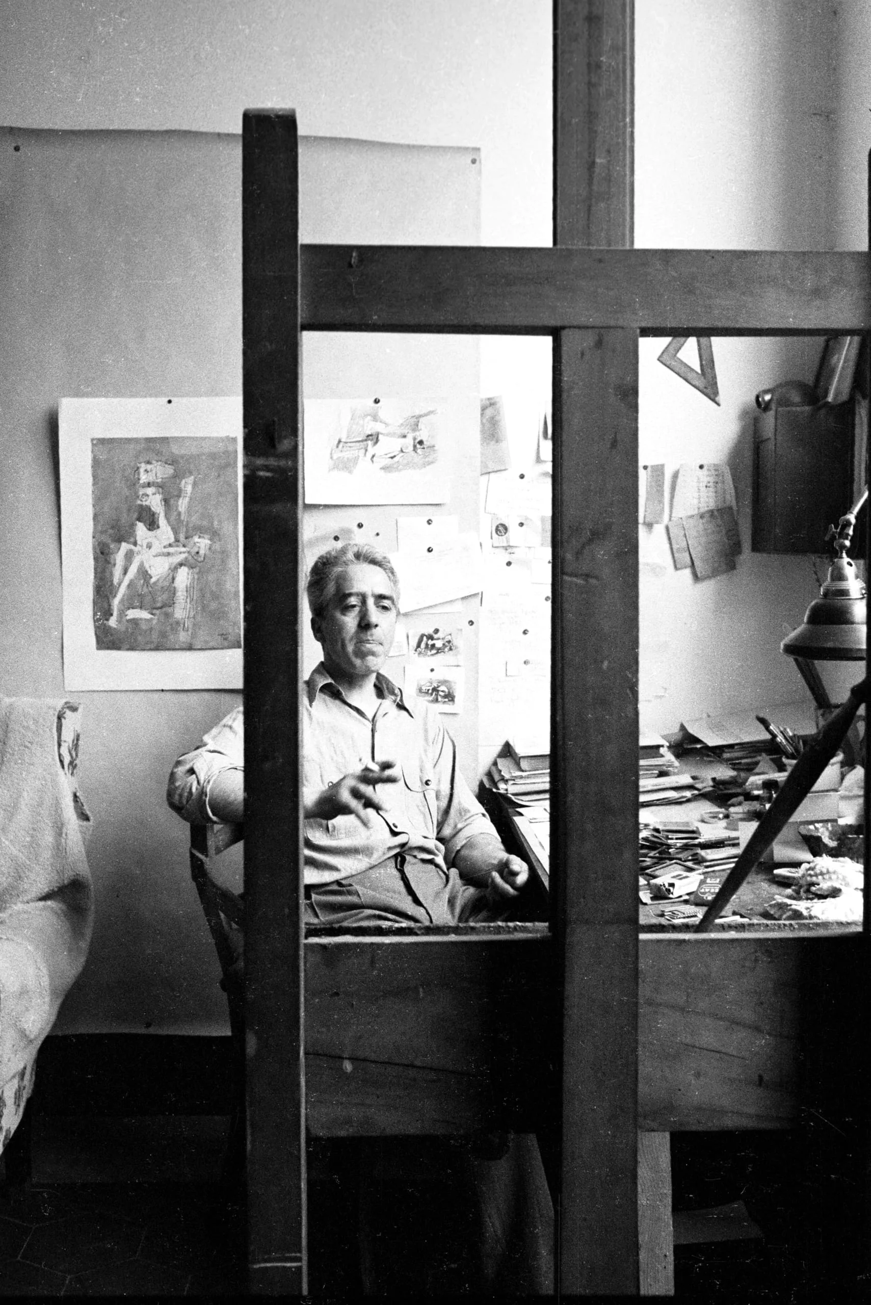 Black and white photograph of a man seated at a cluttered desk, seen through the wooden bars of a stretcher frame, with sketches and papers pinned to the wall behind him