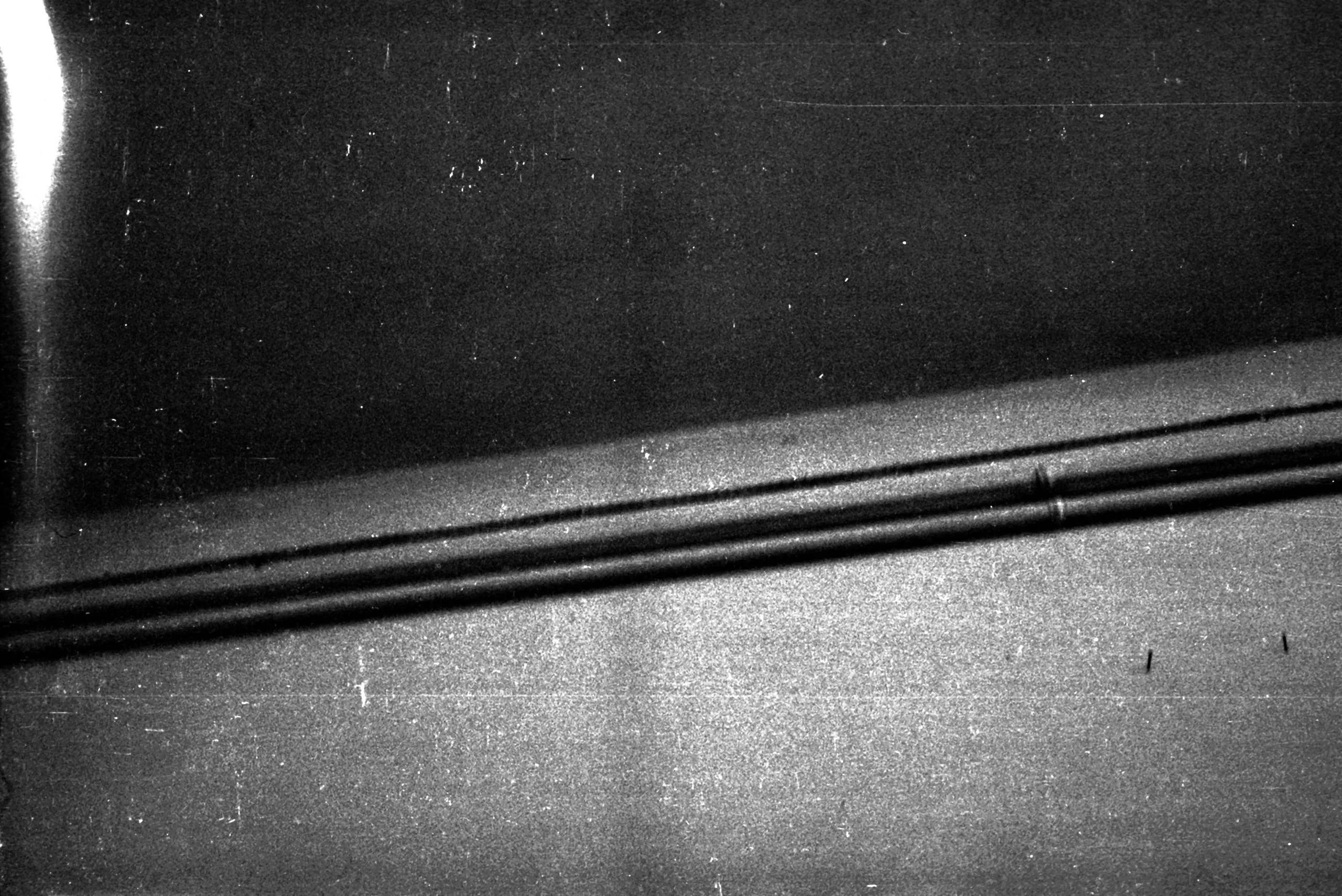 Black and white photograph of two parallel cylindrical rods running diagonally across a flat surface, with high grain and visible film scratches