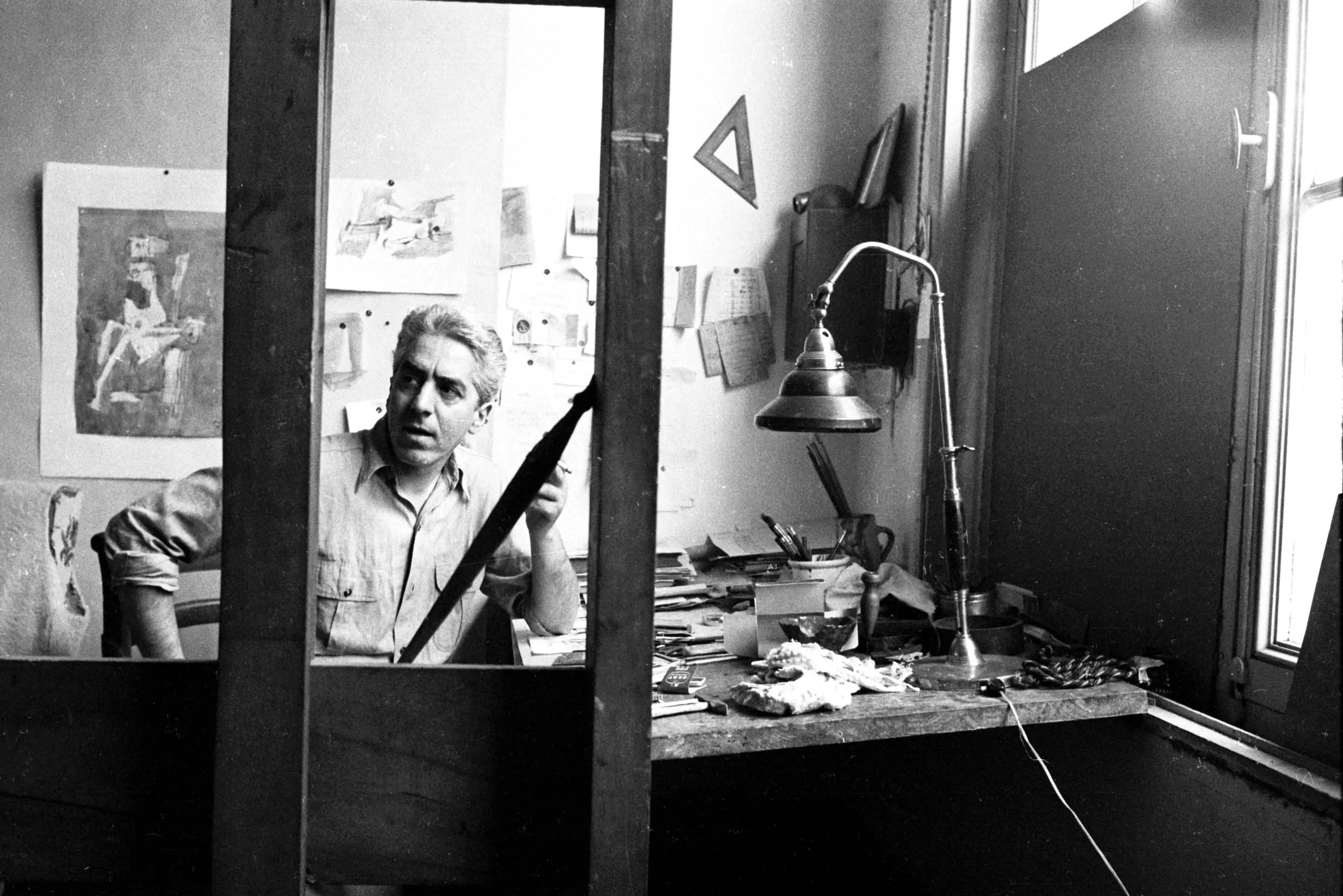 Black and white photograph of a man in a short-sleeved shirt seen through a glass partition in a studio, holding a long tool, with a cluttered worktable and pinned drawings visible behind him