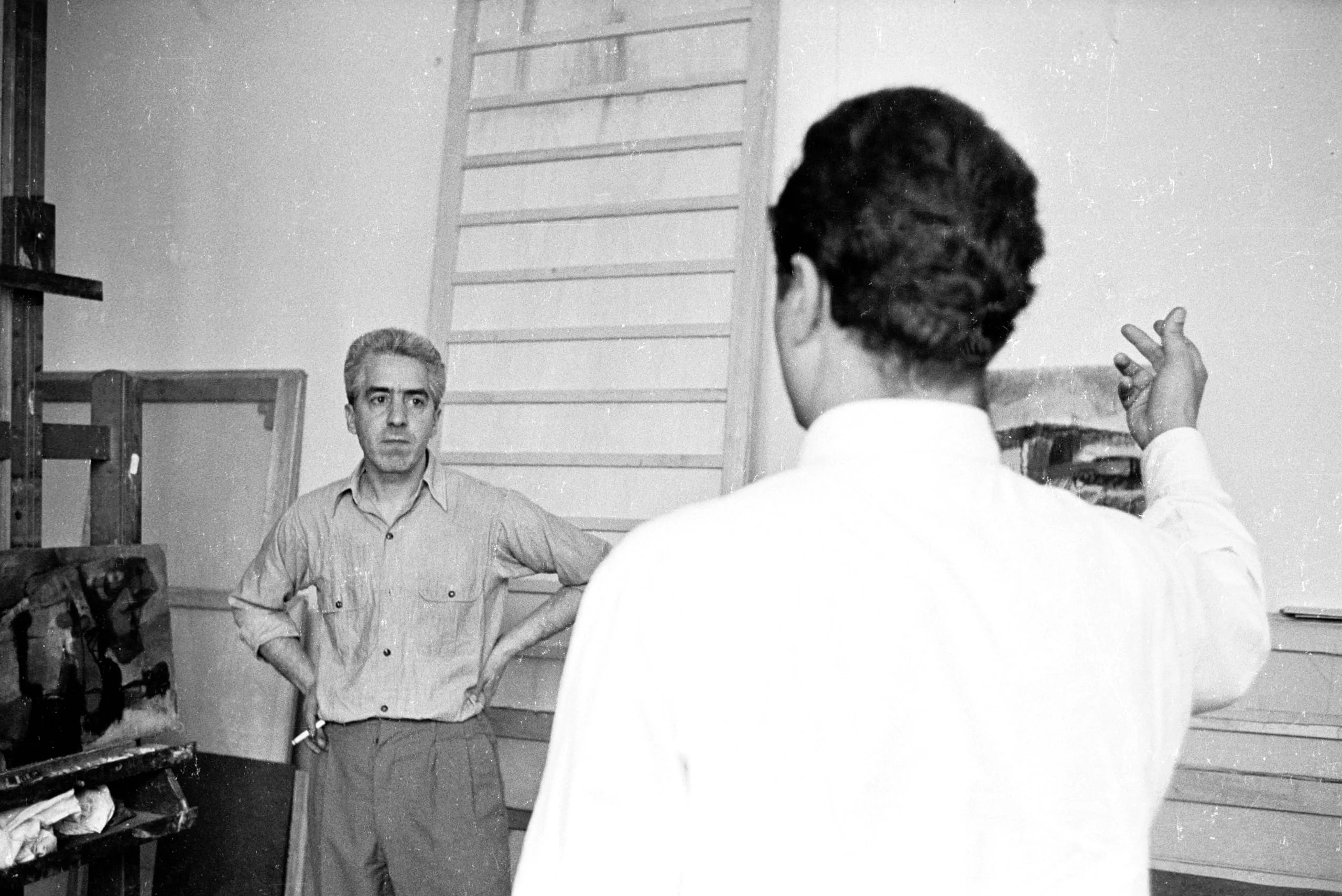Black and white photograph of two people in an artist's studio, one man facing the camera with hands on hips, one figure seen from behind with arm raised