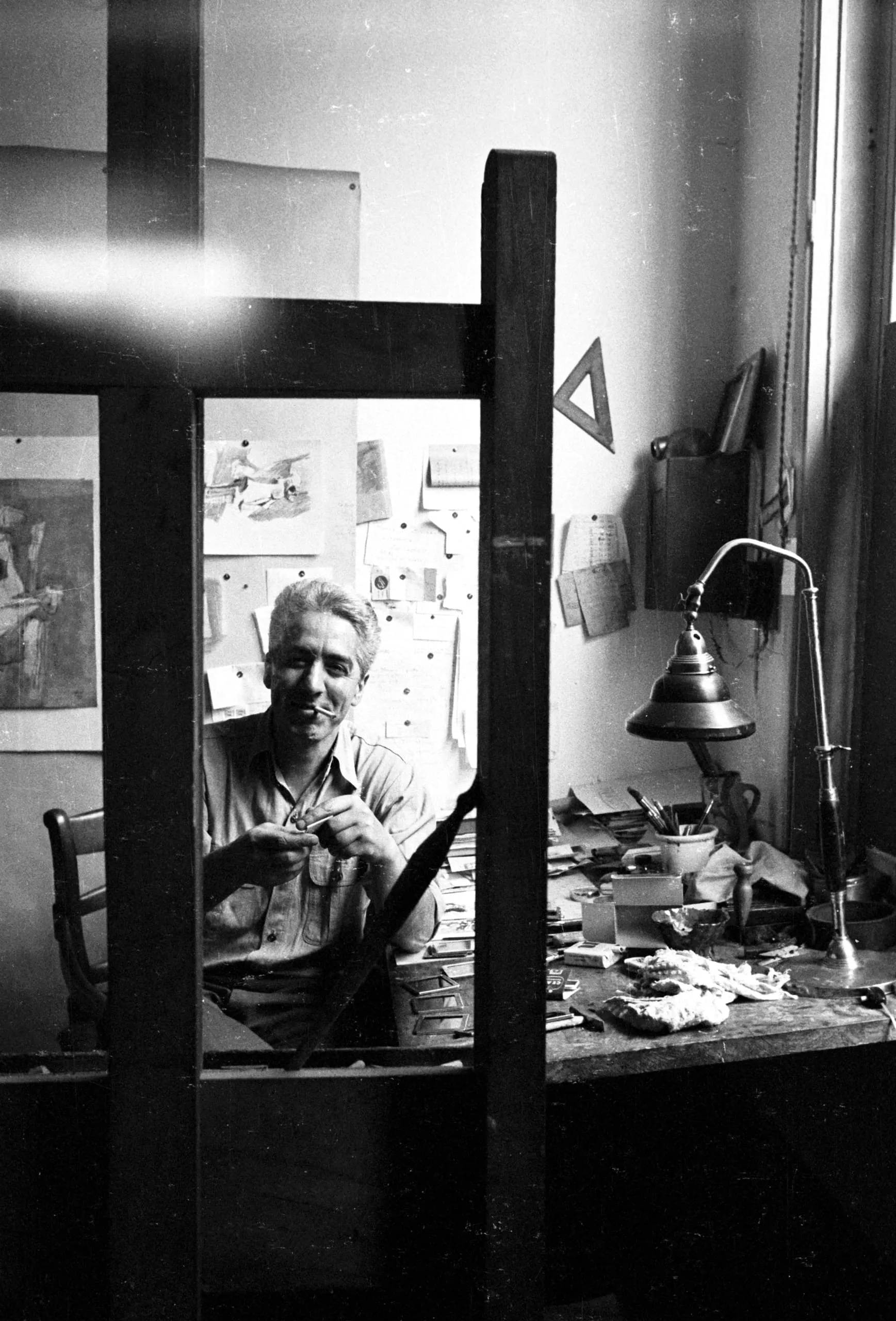 Black and white photograph of a dark-haired man seated at a cluttered worktable, seen through a large wooden frame structure in the foreground, holding a small object and looking toward the camera