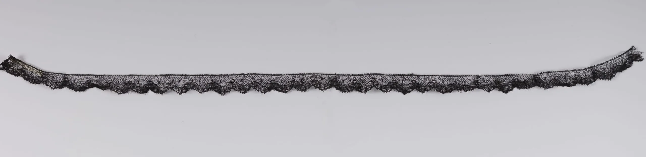 Long, narrow strip of black lace with repeating scalloped lower edge and floral motifs on an open mesh ground, photographed flat against a gray background