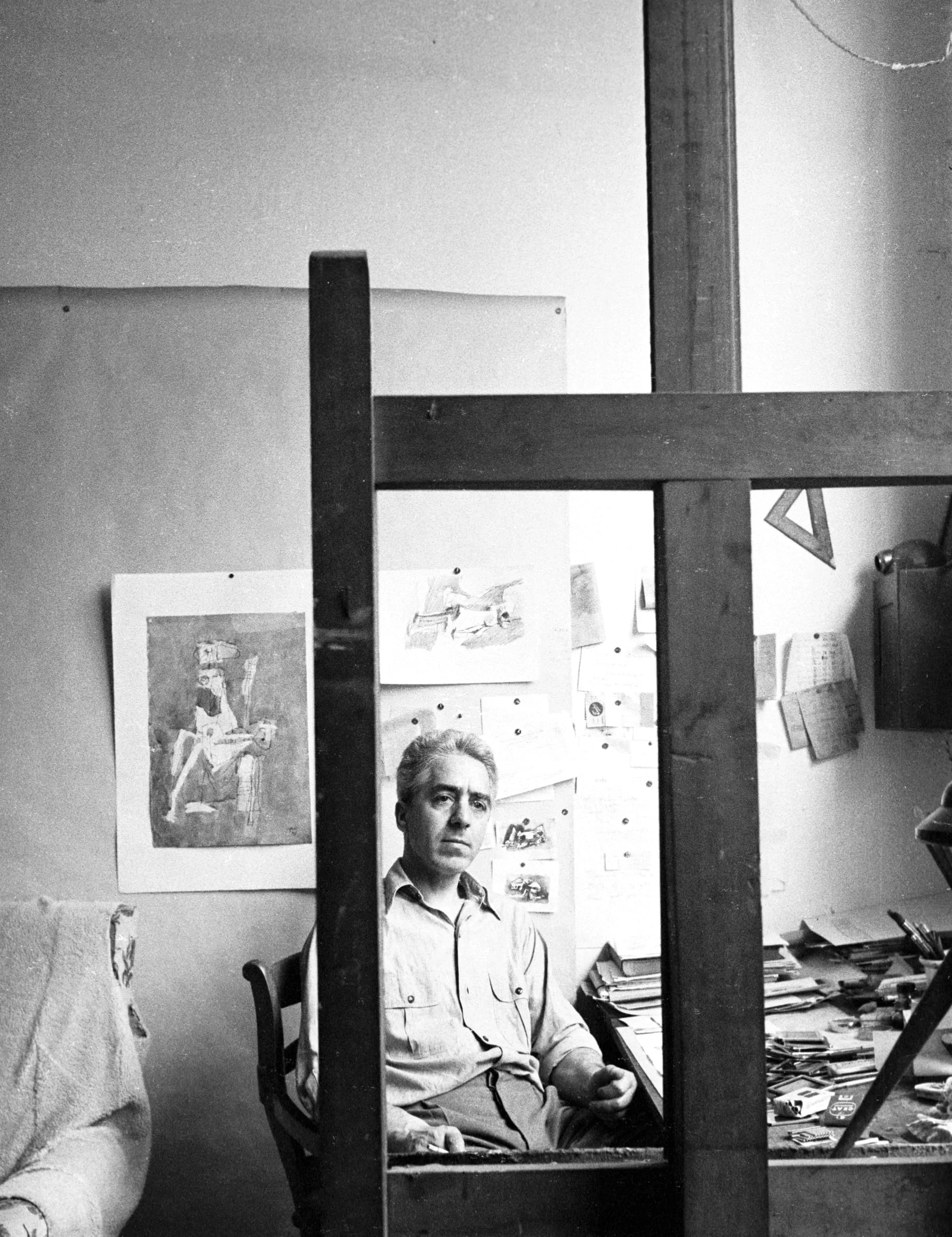 Black and white photograph of a man seated in a studio, seen through the rectangular opening of a large wooden easel, with sketches and papers pinned to the wall behind him