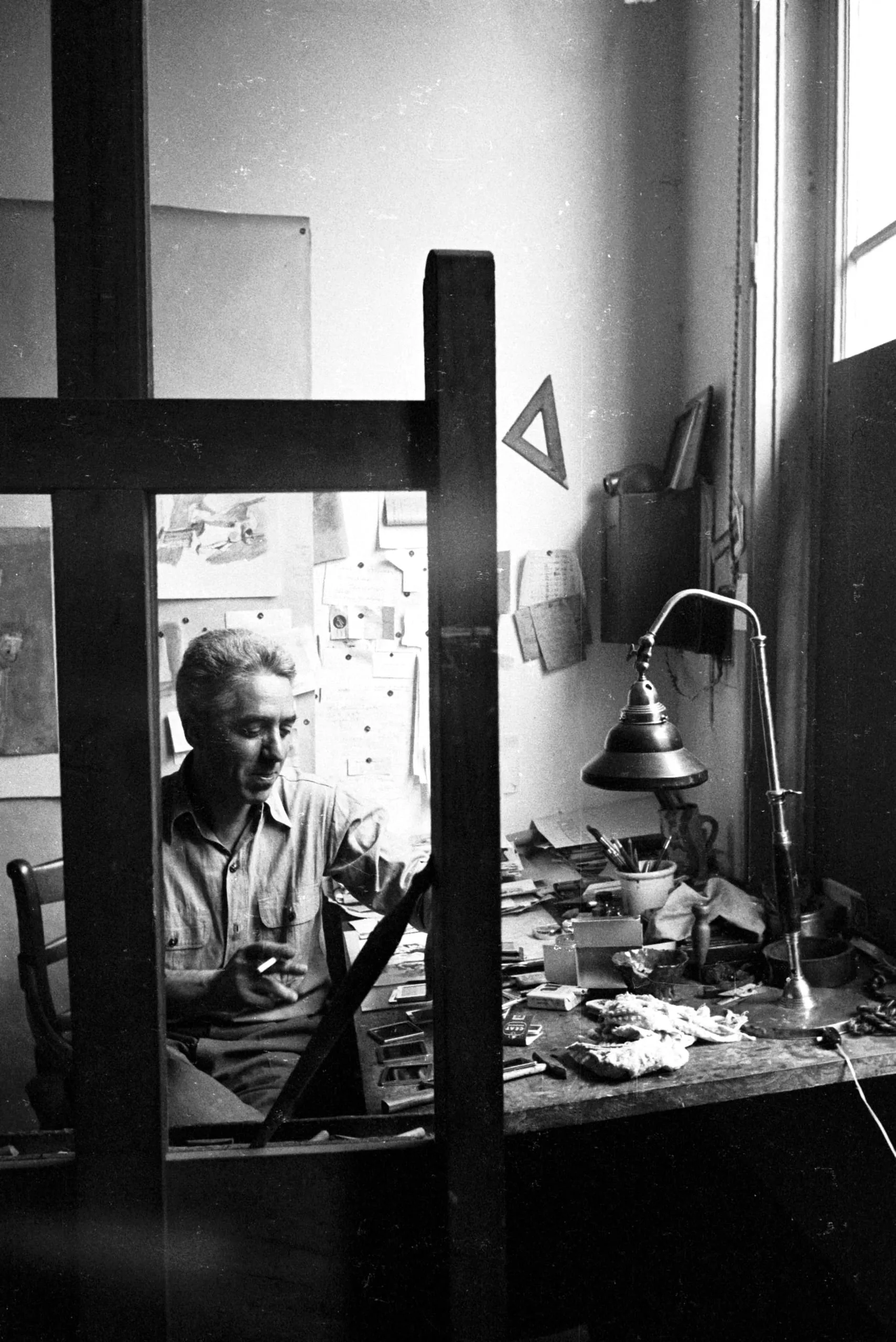 Black and white photograph of a man seated at a cluttered worktable, seen through a large dark rectangular frame, with a gooseneck lamp and bright window to the right
