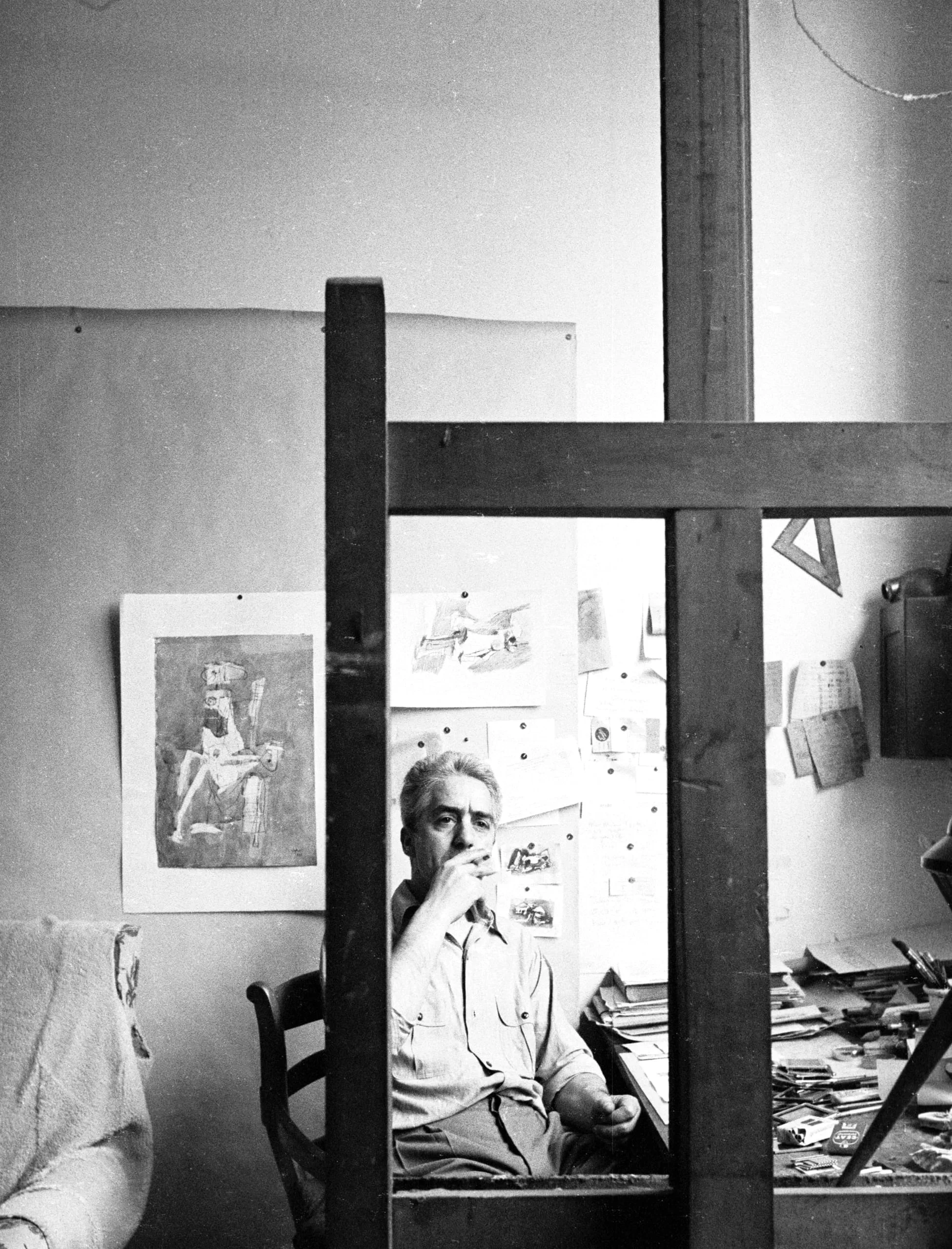 Black and white photograph of a man seated at a cluttered desk, seen through the opening of a large wooden frame structure, with sketches and papers pinned to the wall behind him