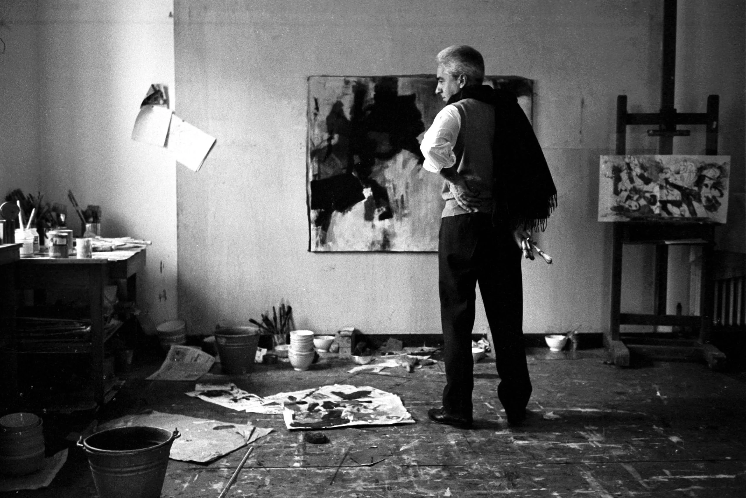 Black and white photograph of a man with short gray hair, viewed from behind, standing in a paint-splattered studio and looking at a large abstract painting on the wall