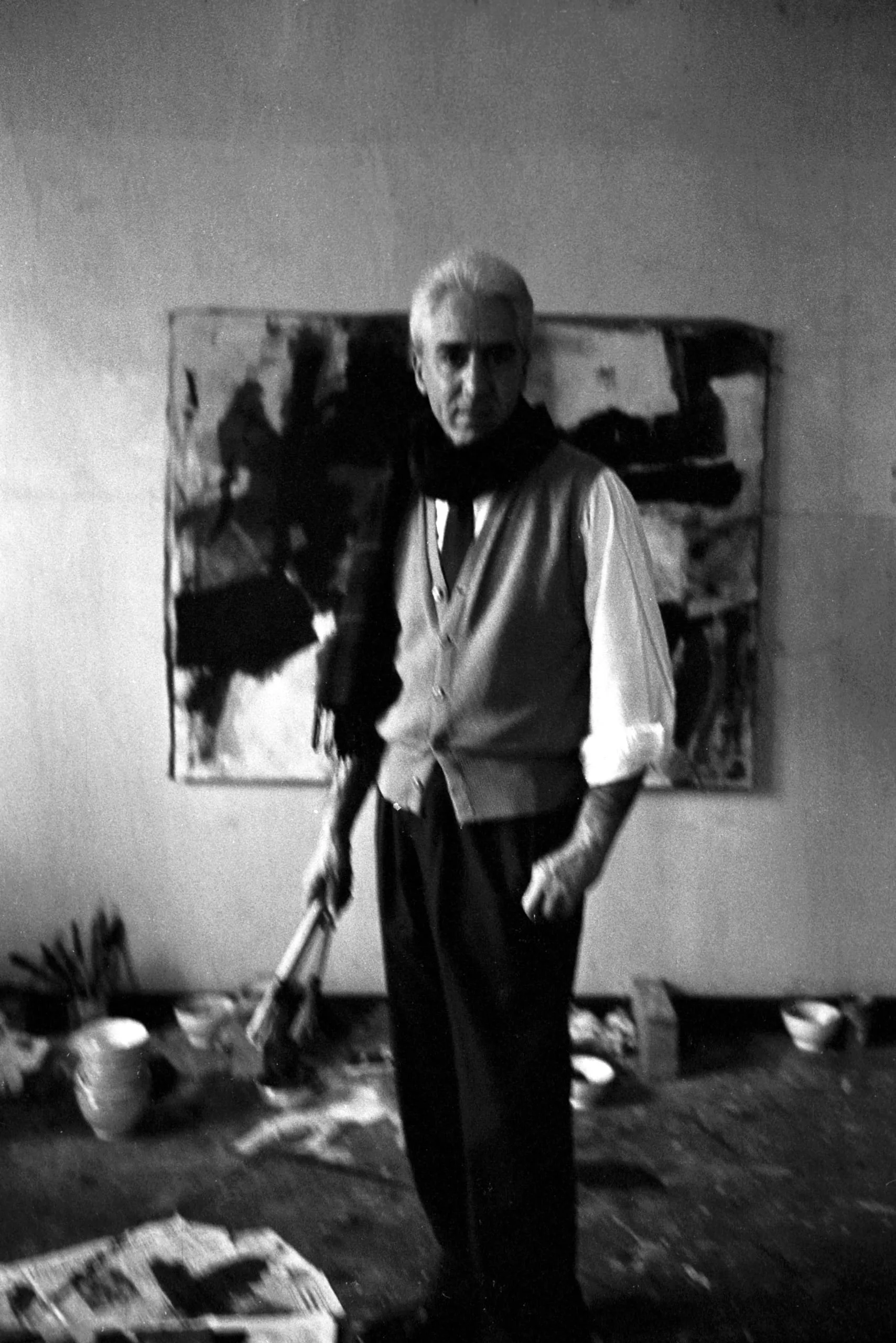 Black and white photograph of a white man with short white hair standing full-length in an art studio, holding a large paintbrush, with an abstract painting on the wall behind him