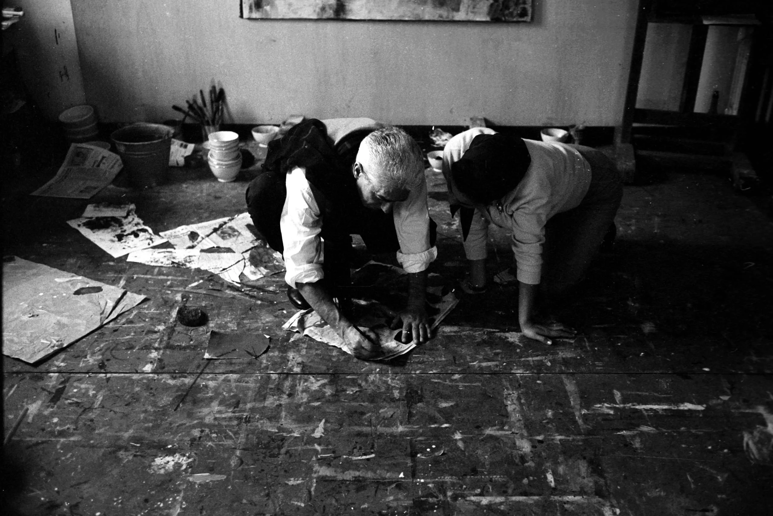 Black and white photograph of two figures crouched over ink-marked papers on a paint-stained wooden studio floor, bowls and brushes visible on a shelf in the background