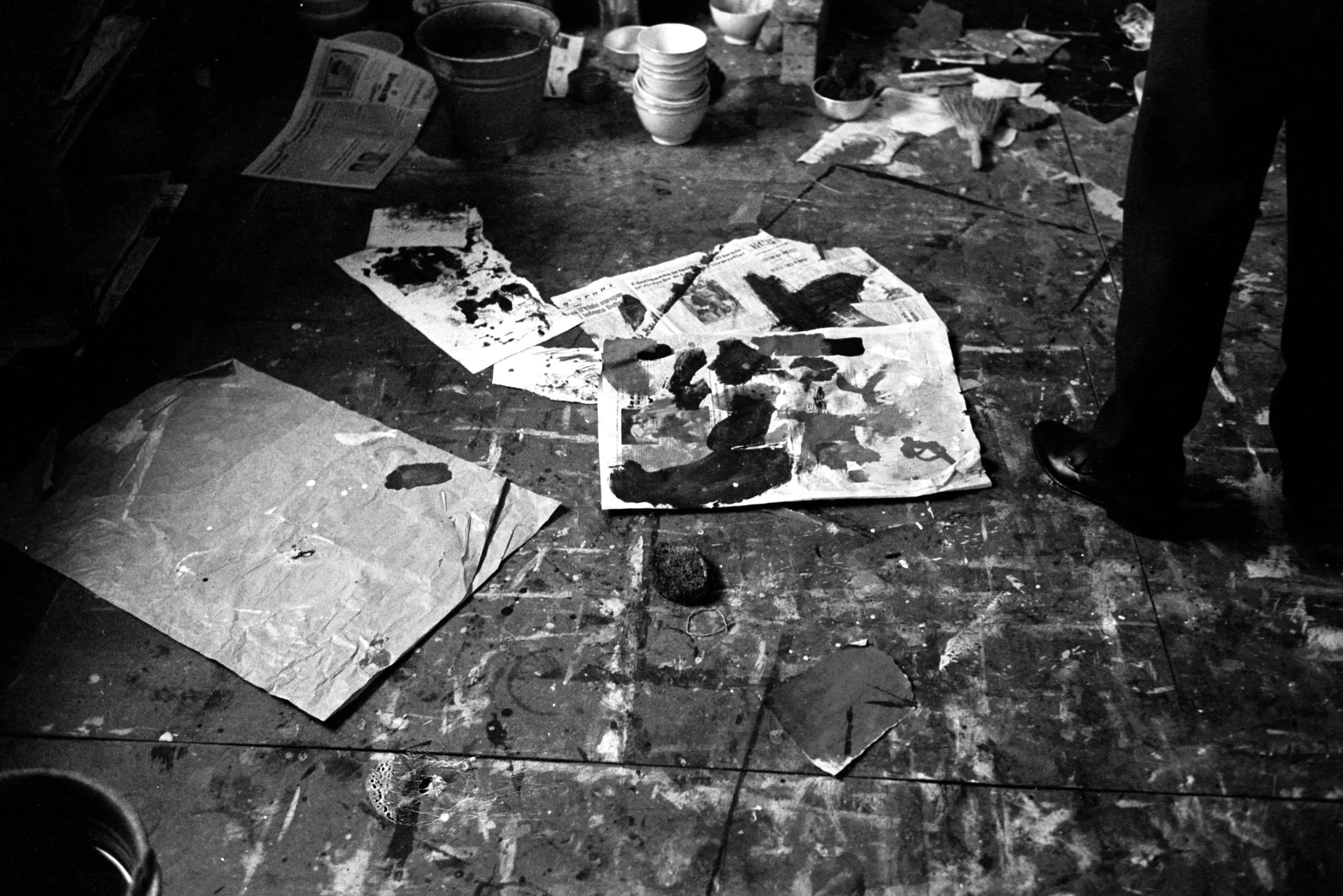 Black and white photograph looking down at a paint-spattered studio floor scattered with newspaper sheets, cardboard, and dark paint smears, with a person's legs visible at the right edge