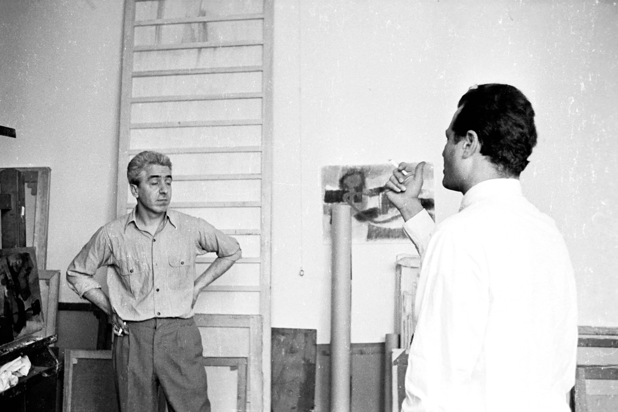 Black and white photograph of two men in an artist's studio, one facing forward with hands on hips, the other seen from behind gesturing toward a small painting on the wall