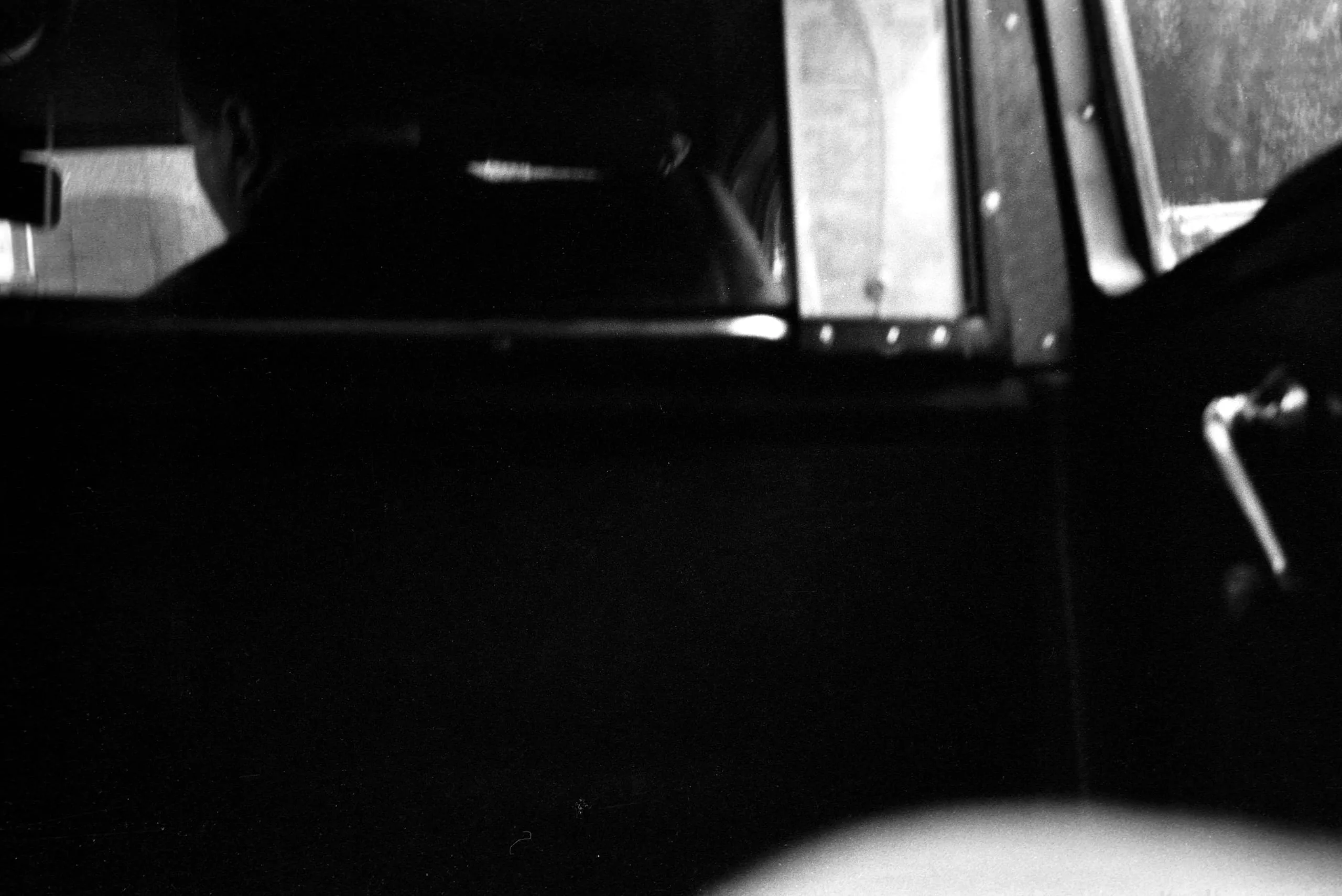 Black and white photograph shot from a low angle inside a vehicle, with dark interior panels, a chrome strip, a partially visible figure in the upper left, and a riveted door panel to the right