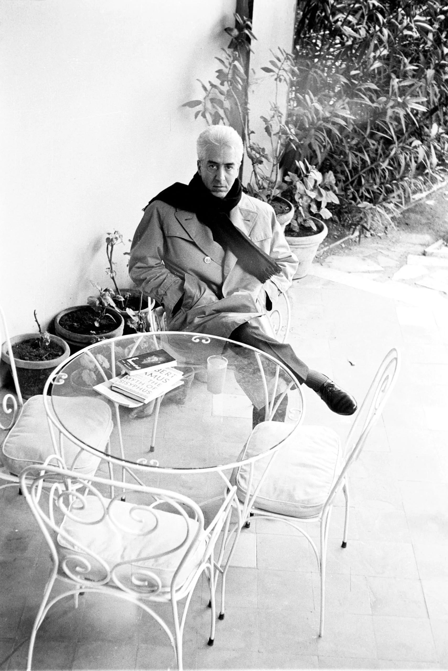 Black and white photograph of a white-haired man in a trench coat seated at a glass-topped wrought-iron café table on a patio, looking directly at the camera