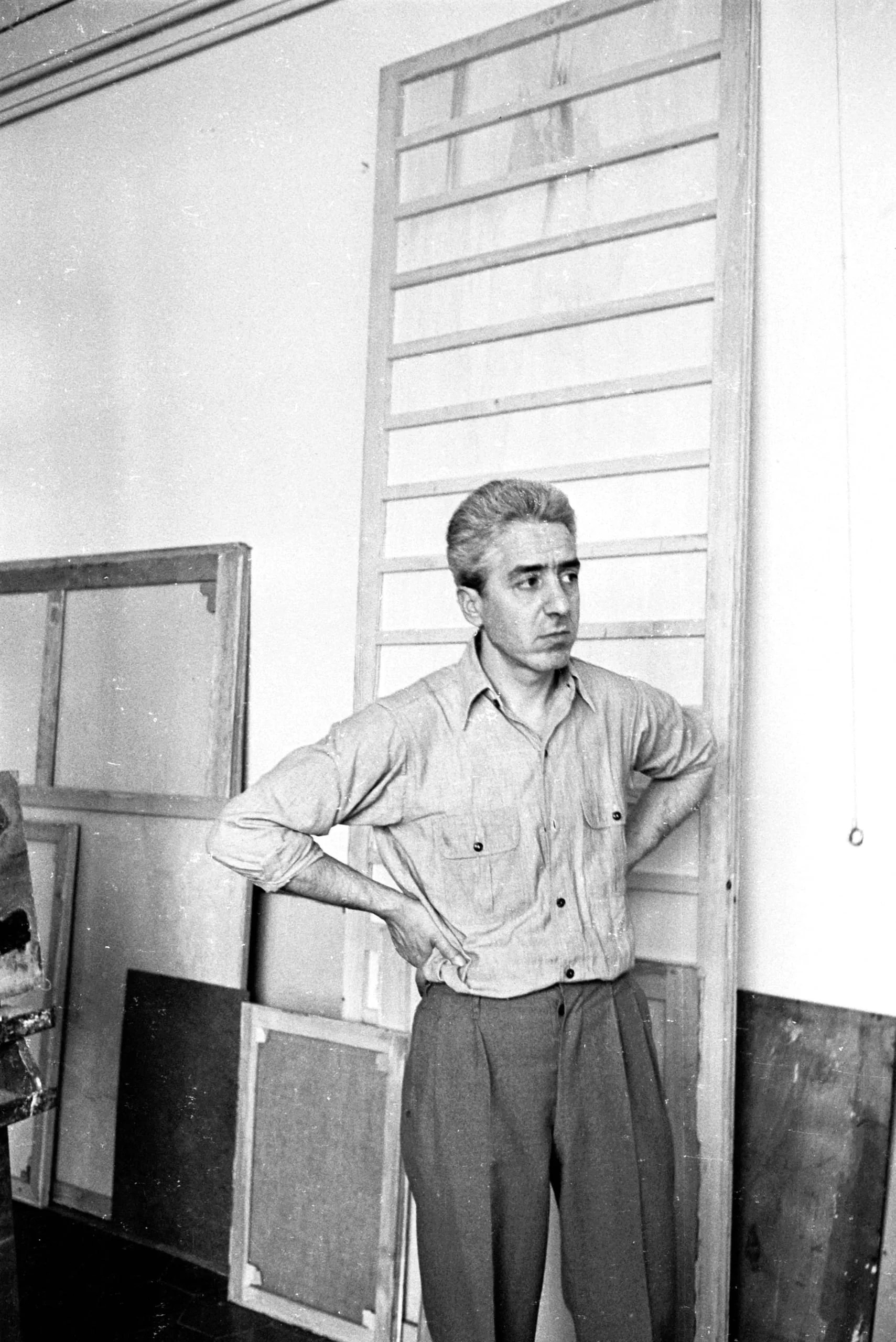 Black and white photograph of a man standing with hands on hips in an artist's studio, surrounded by canvas stretchers leaning against the wall