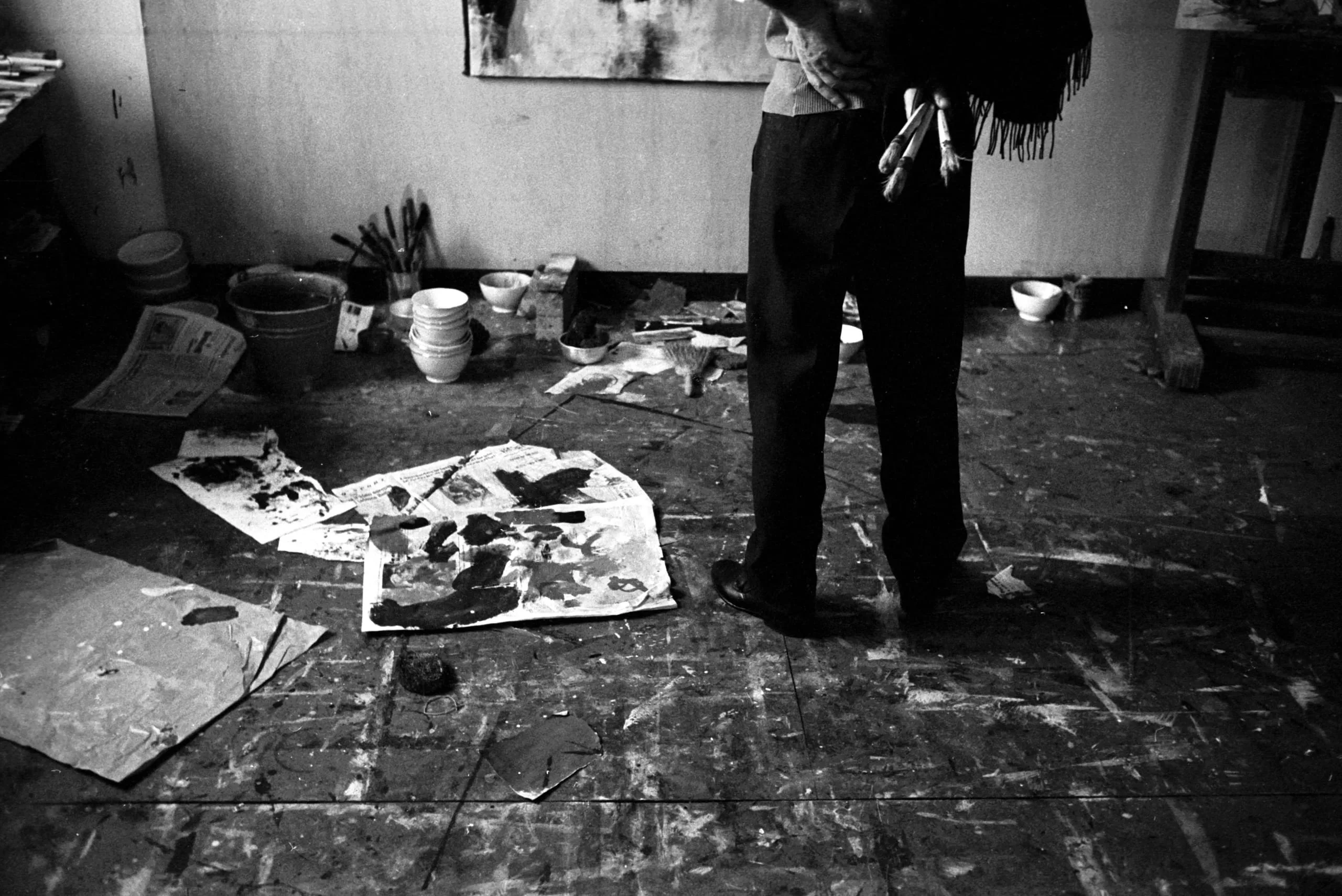 Black and white photograph of an artist's studio floor, with a figure's legs and feet visible beside a large sheet of paper covered in bold black brushstrokes