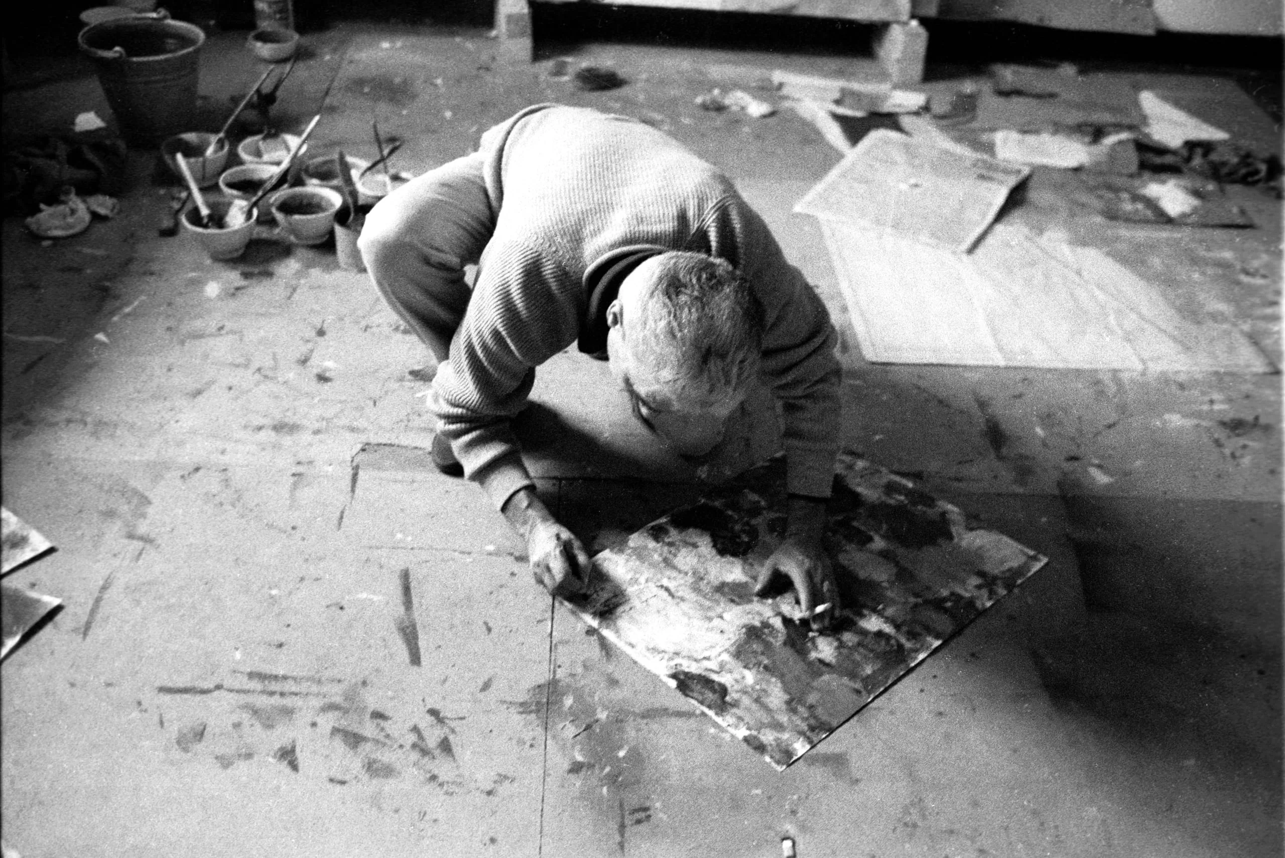 Black and white photograph of a man kneeling on a paint-splattered studio floor, hunched over a small canvas, working with a brush or tool