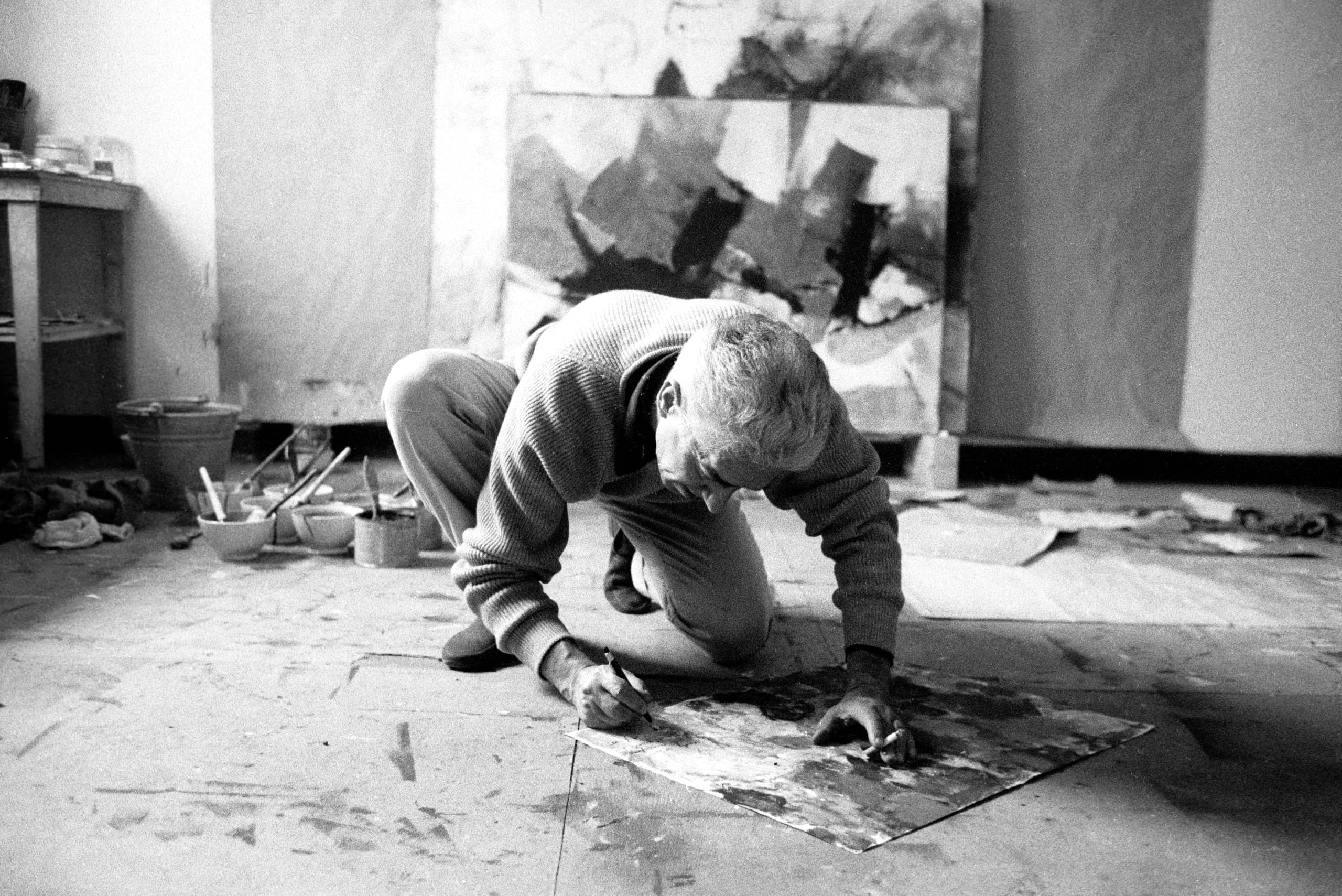 Black and white photograph of an older man kneeling on a paint-covered studio floor, hunched over a small canvas, working with a brush or knife