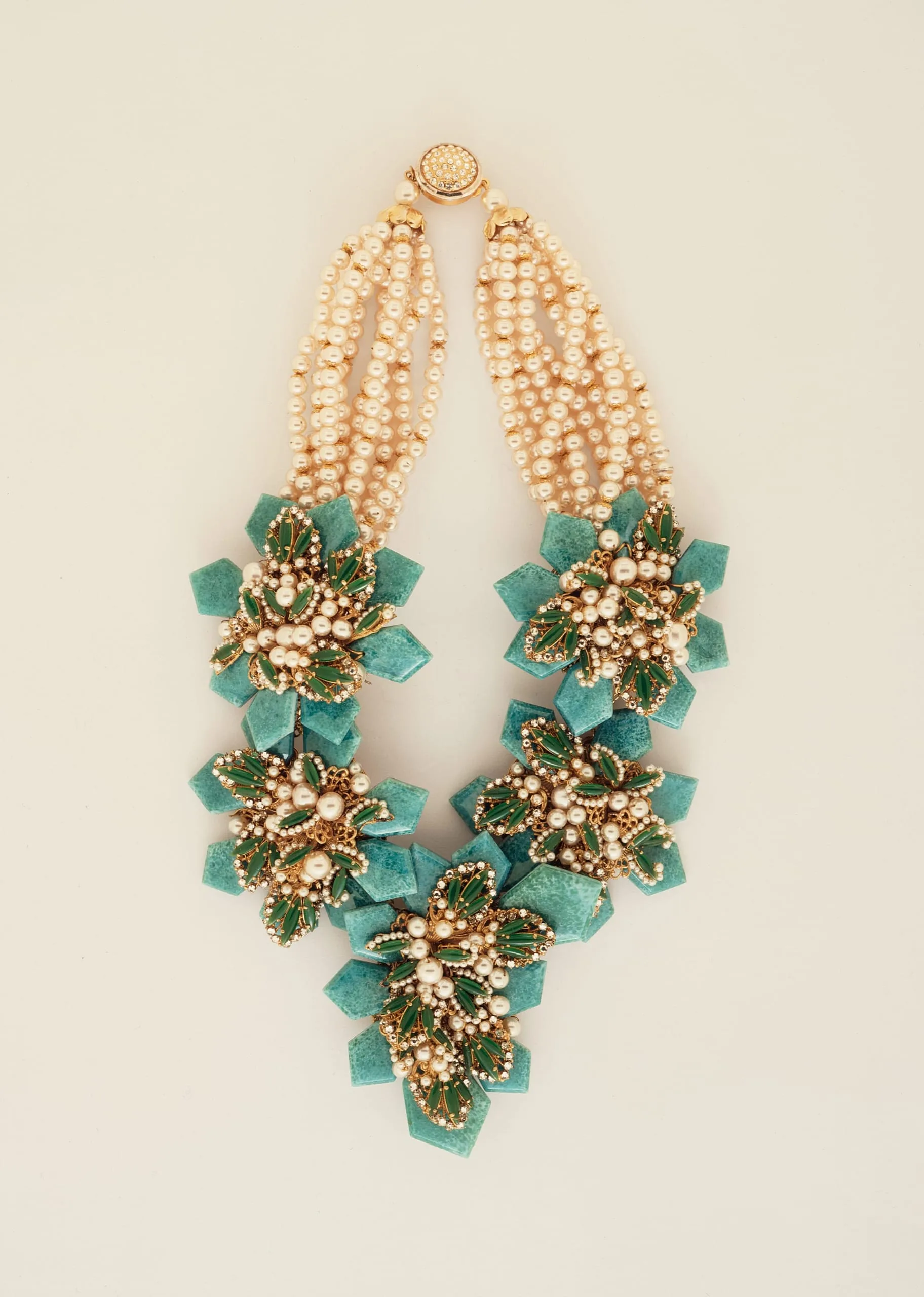 - Glass faux turquoise and jade, alabaster-base faux pearls, glass seed pearls, faux diamonds, 18 kt gold-electroplated brass, silver-plated metal