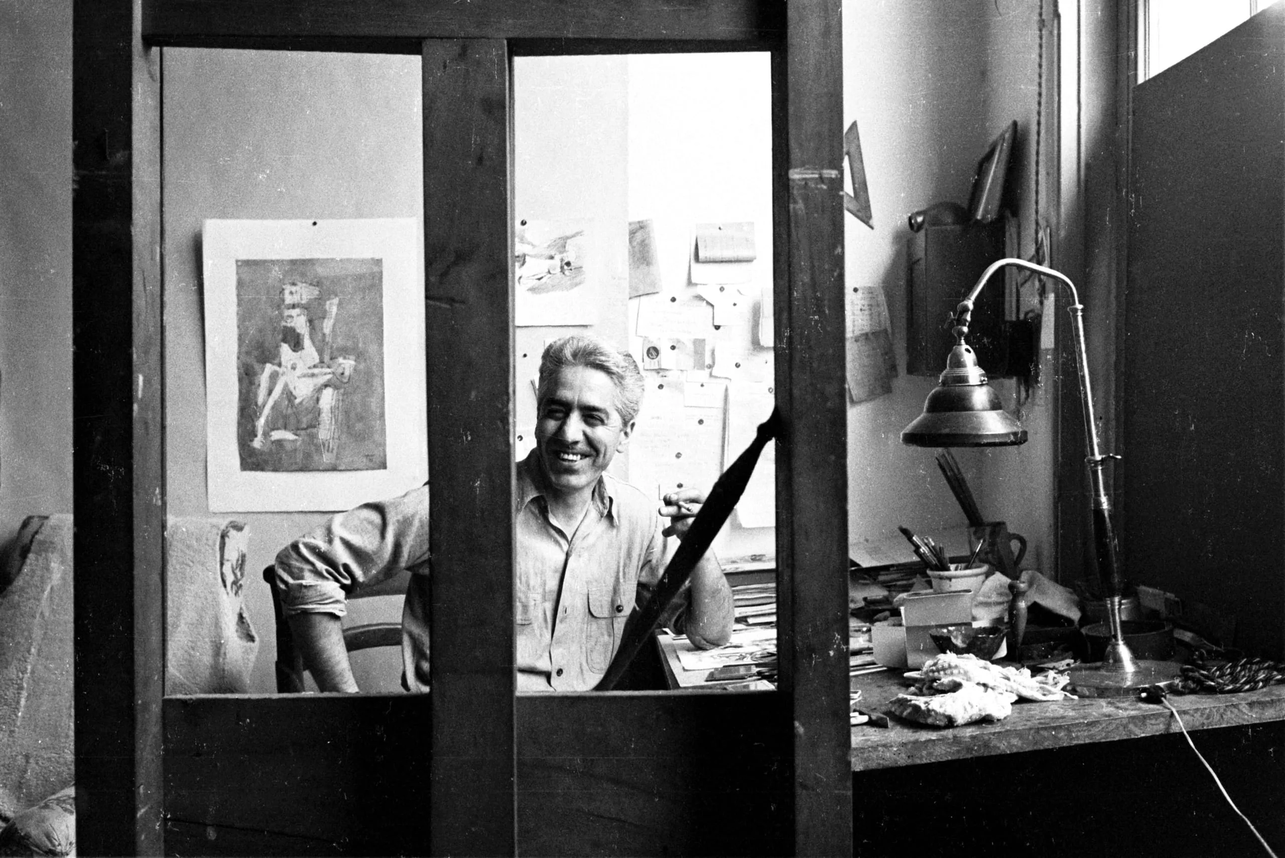 Black and white photograph of a man with gray-streaked hair smiling through wooden-framed glass panels in an artist's studio, with pinned drawings and a cluttered worktable visible behind him
