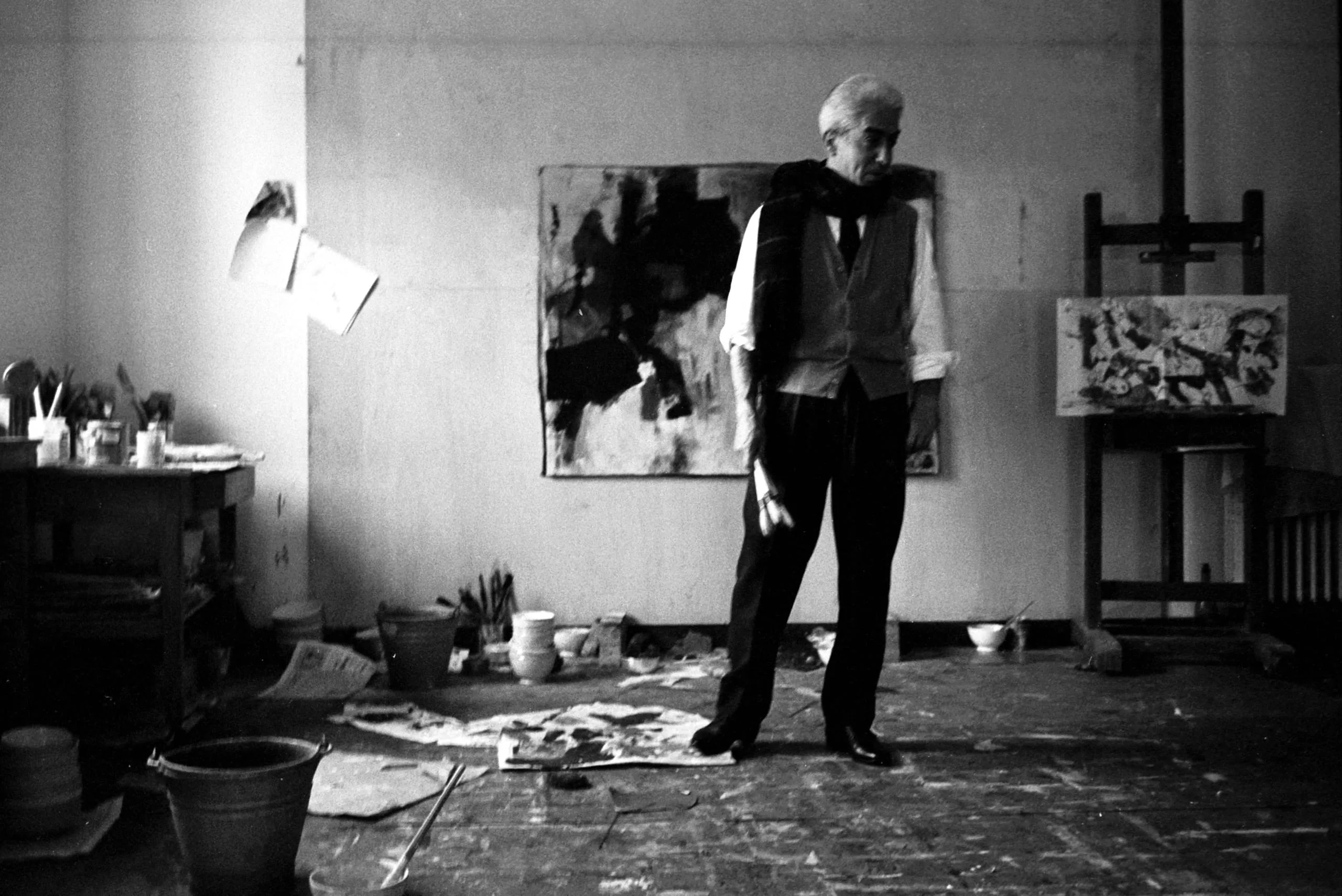 Black and white photograph of an elderly man standing in a paint-splattered artist's studio, wearing a dark vest and trousers, surrounded by canvases, brushes, and art supplies