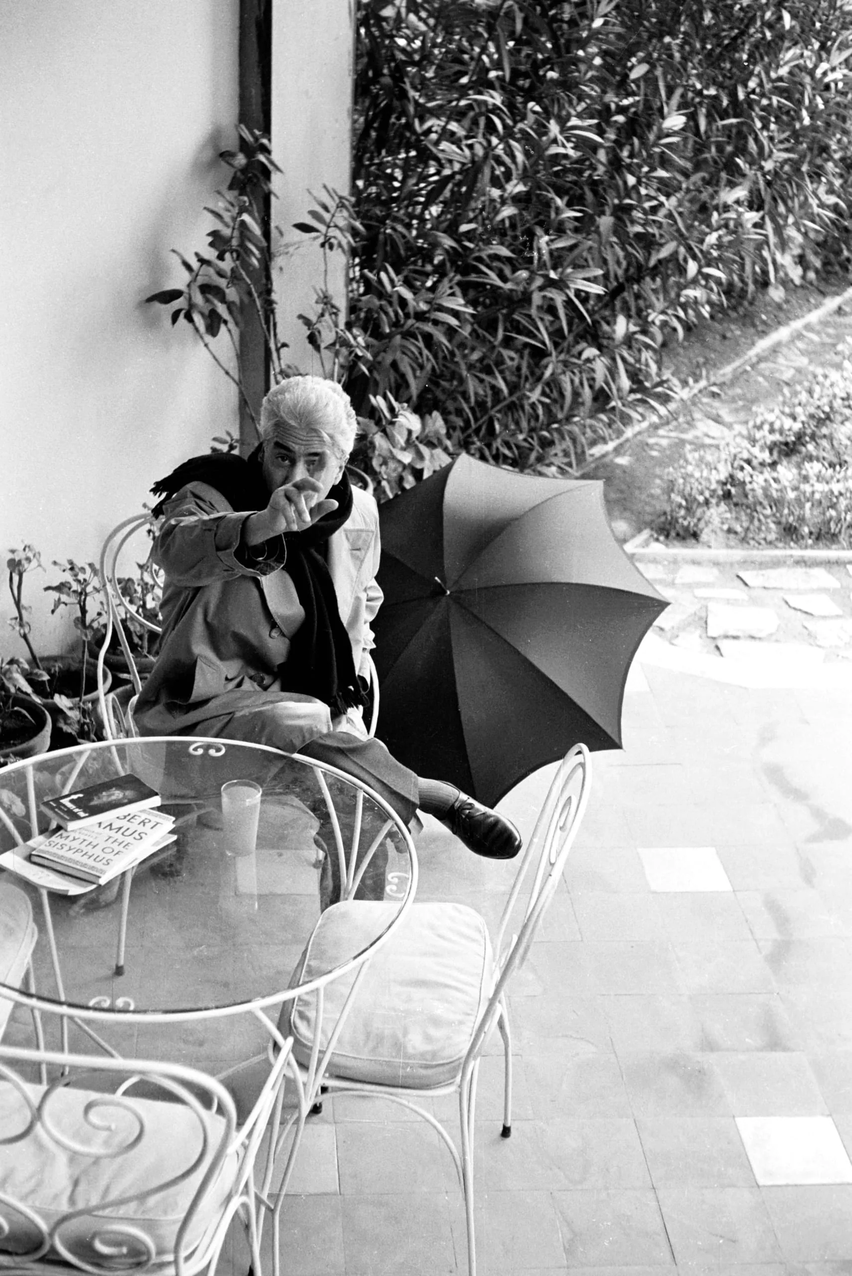 Black and white photograph, older white man with white hair seated at an outdoor wrought-iron table, one hand raised toward his mouth, an open umbrella propped beside him
