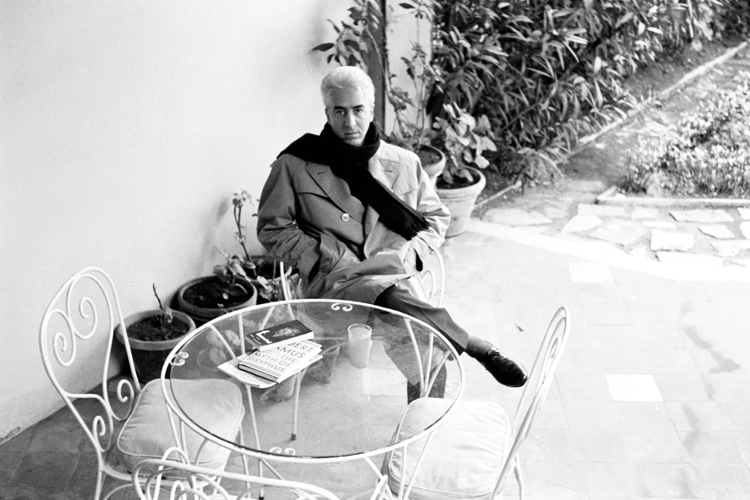 Black and white photograph of a white-haired man in an overcoat and dark scarf seated at a glass-topped wrought-iron table on a terrace, legs crossed, looking directly at the camera