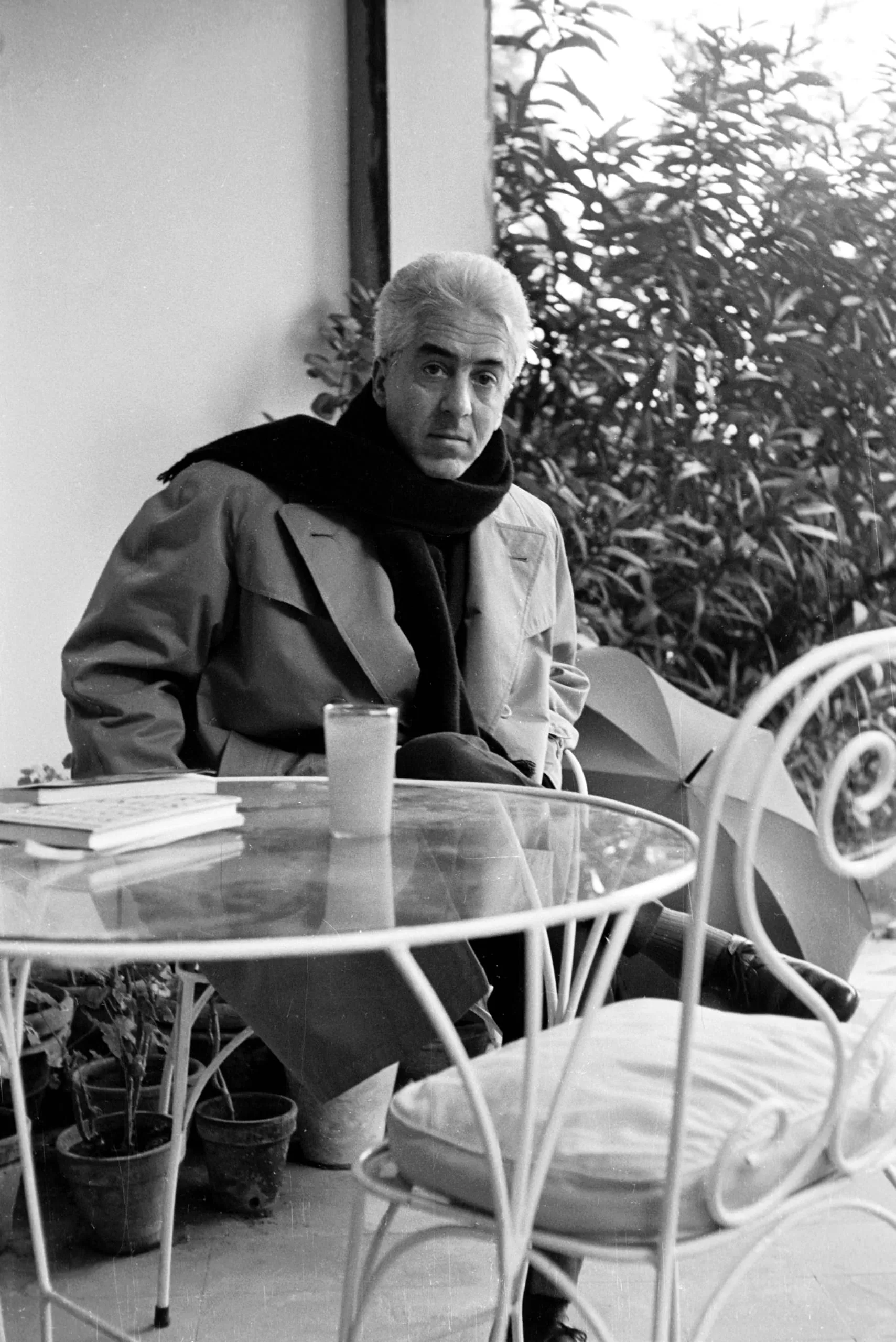Black and white photograph of a pale-haired man in a jacket and dark turtleneck seated at a glass-topped outdoor table, looking directly at the camera