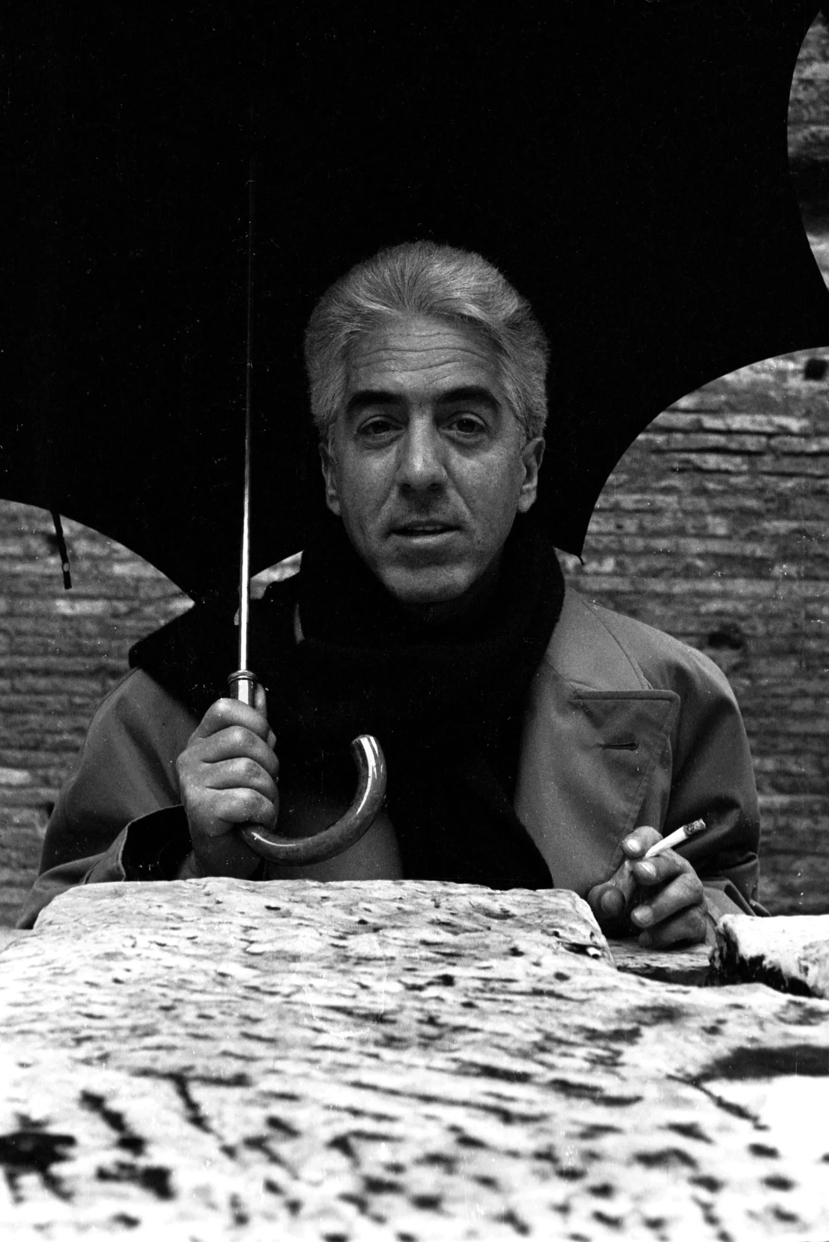 Black and white photograph, man from the chest up behind a stone ledge, holding an open umbrella and a cigarette, with a brick wall behind him