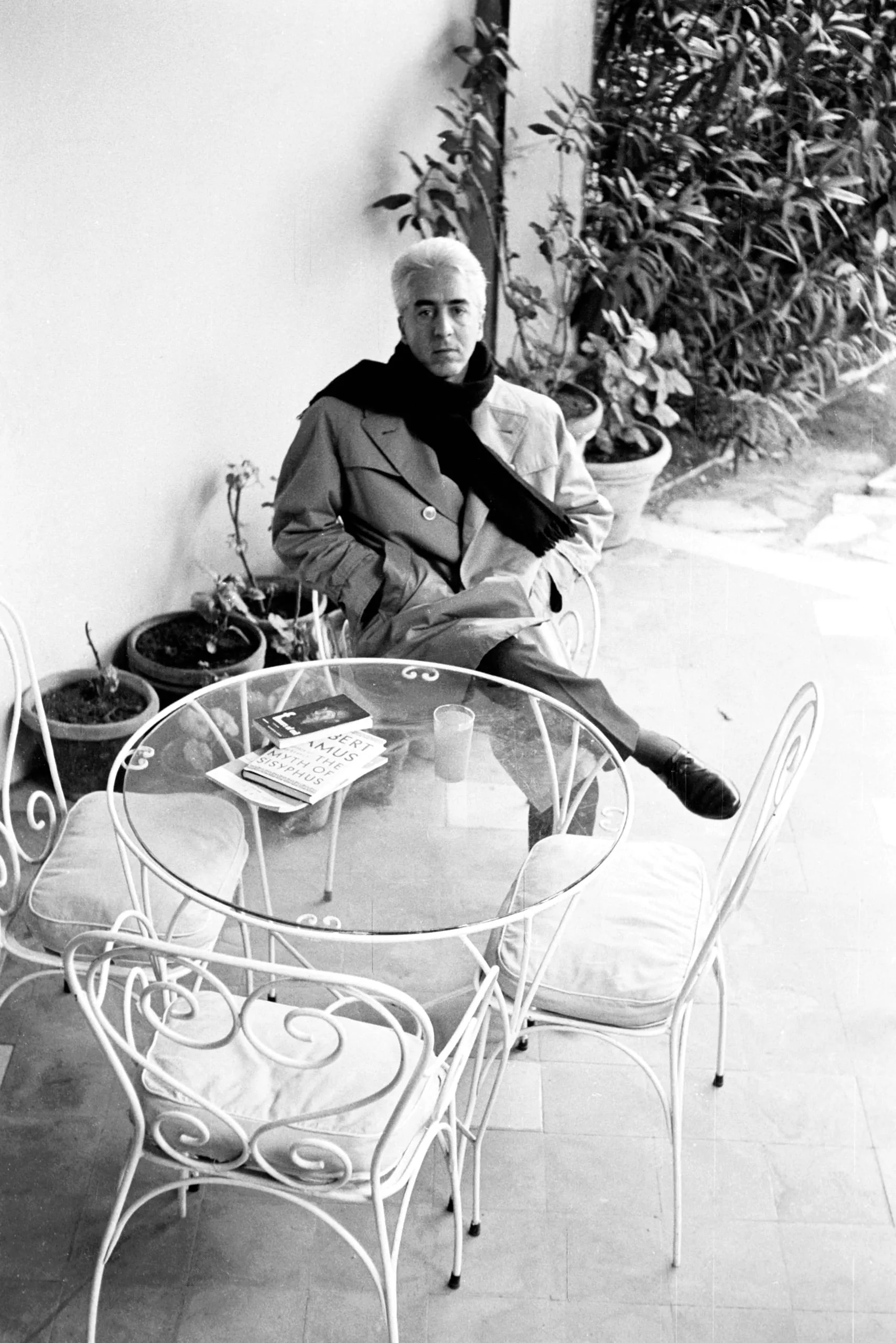 Black and white photograph of a white-haired man in a trench coat and dark scarf seated at a glass-topped wrought iron patio table, legs crossed, looking directly at the camera