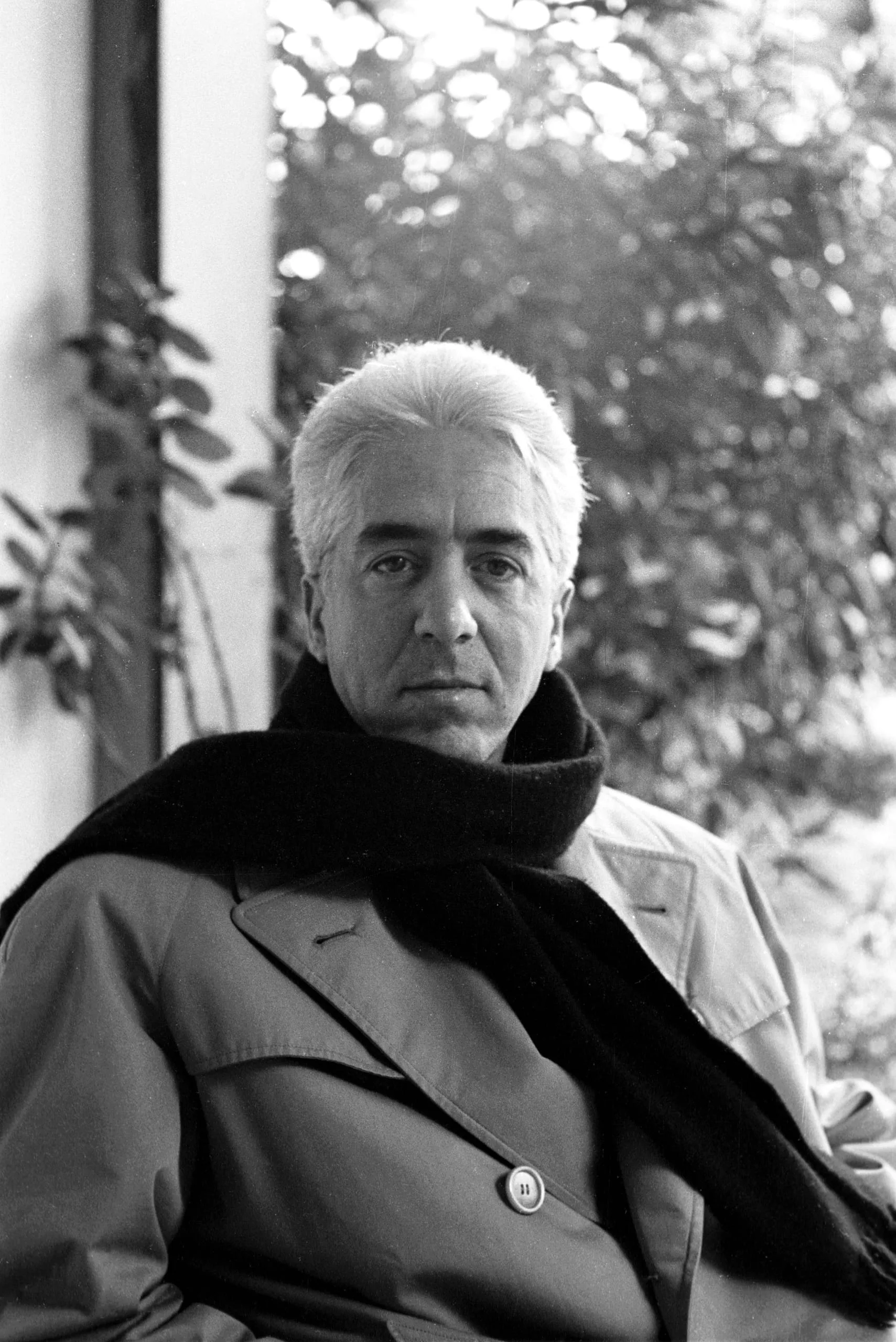Black and white portrait photograph, white-haired man in three-quarter view, wearing a dark scarf and light jacket, softly lit against an out-of-focus leafy background