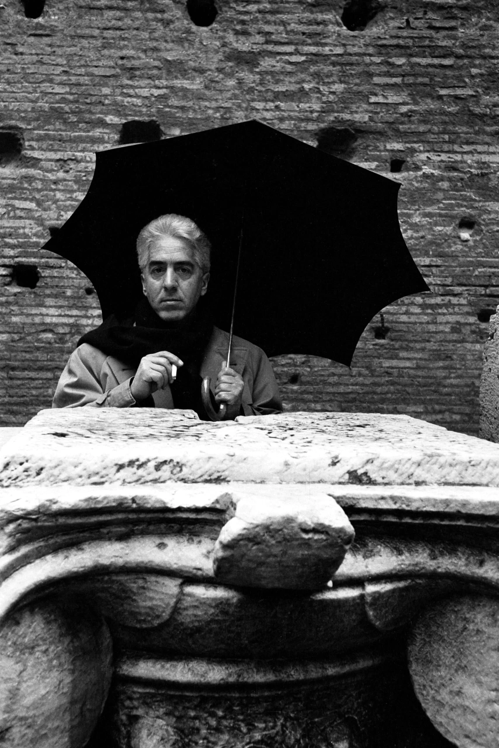 Black and white photograph of a gray-haired man behind a marble architectural fragment, holding an open black umbrella, ancient brick wall behind him