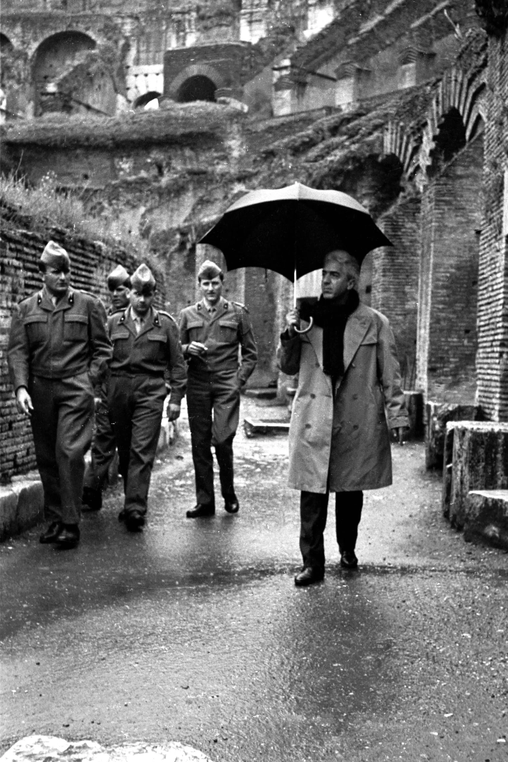 Black and white photograph of a man in a trench coat holding an umbrella walking ahead of three men in military uniforms along a rain-wet path through ancient ruins