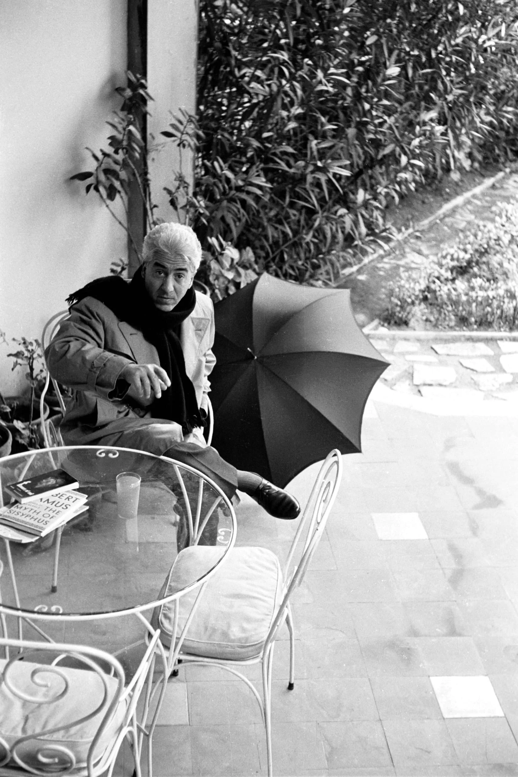 Black and white photograph of a white-haired man in a padded coat seated at a glass-topped wrought iron table on a patio, looking up at the camera, an open umbrella leaning nearby