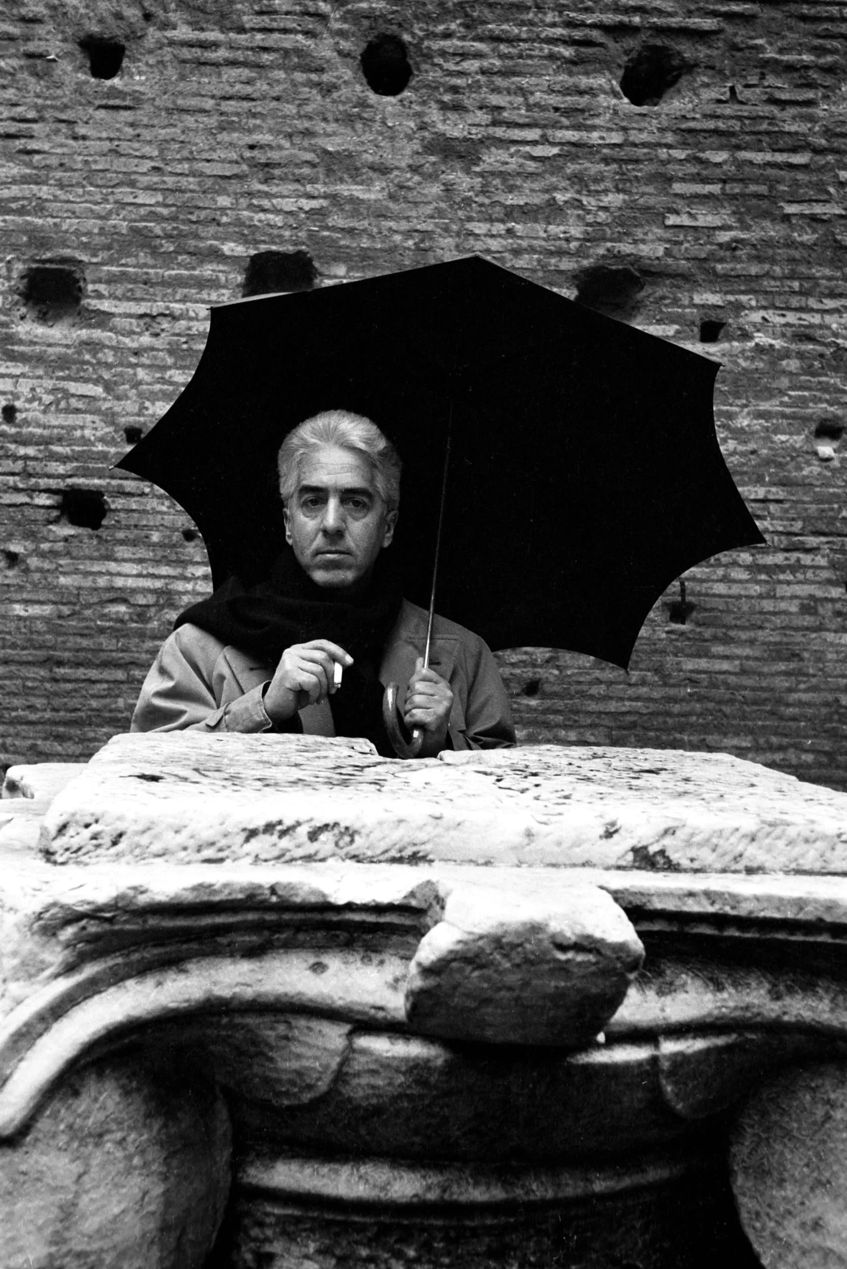 Black and white photograph of a gray-haired man standing behind a weathered stone column capital, holding an open black umbrella, with an ancient brick wall behind him