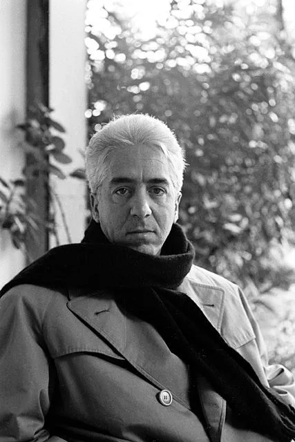 Black and white portrait photograph, man with white hair and crossed arms, wearing a light jacket and dark turtleneck, seated with soft directional lighting