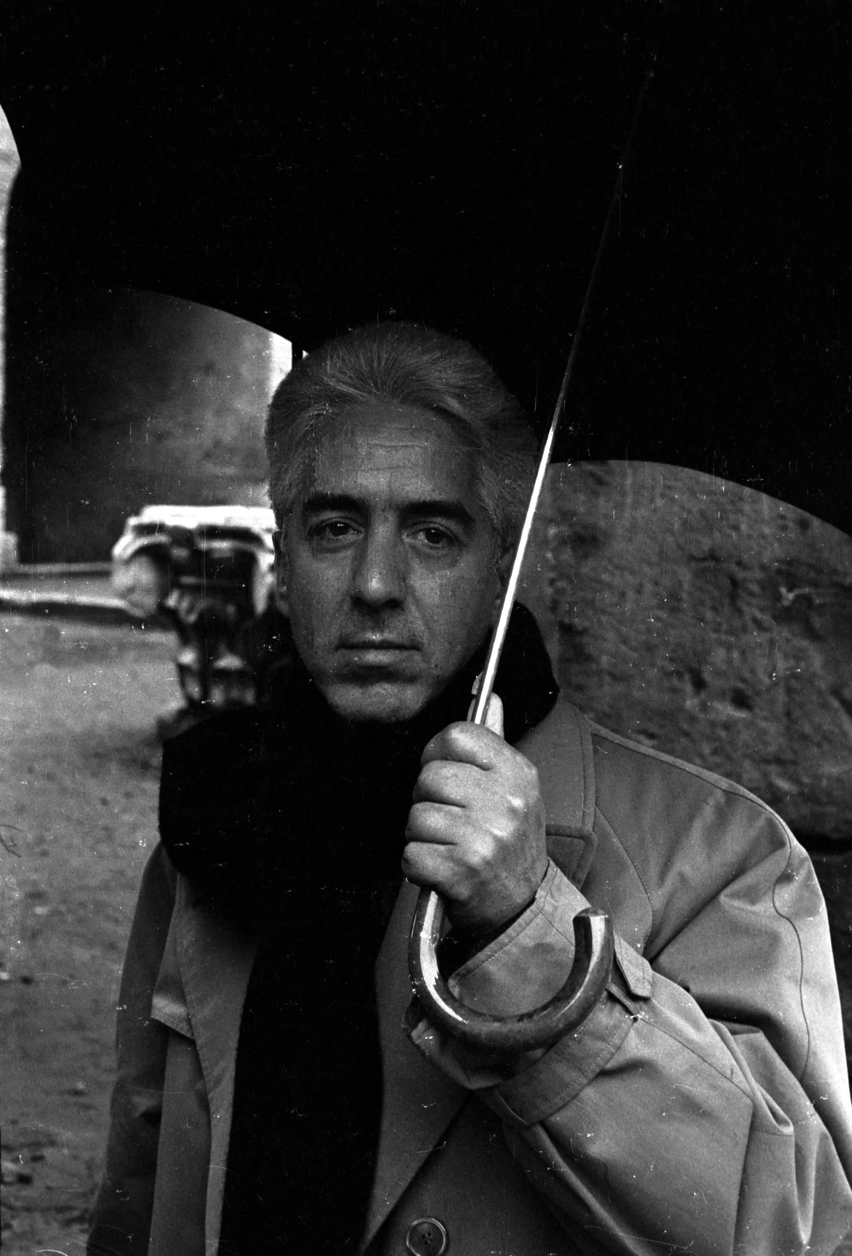 Black and white photograph, waist-up portrait of a gray-haired white man holding a dark umbrella, looking directly at the camera, wearing a trench coat and black scarf