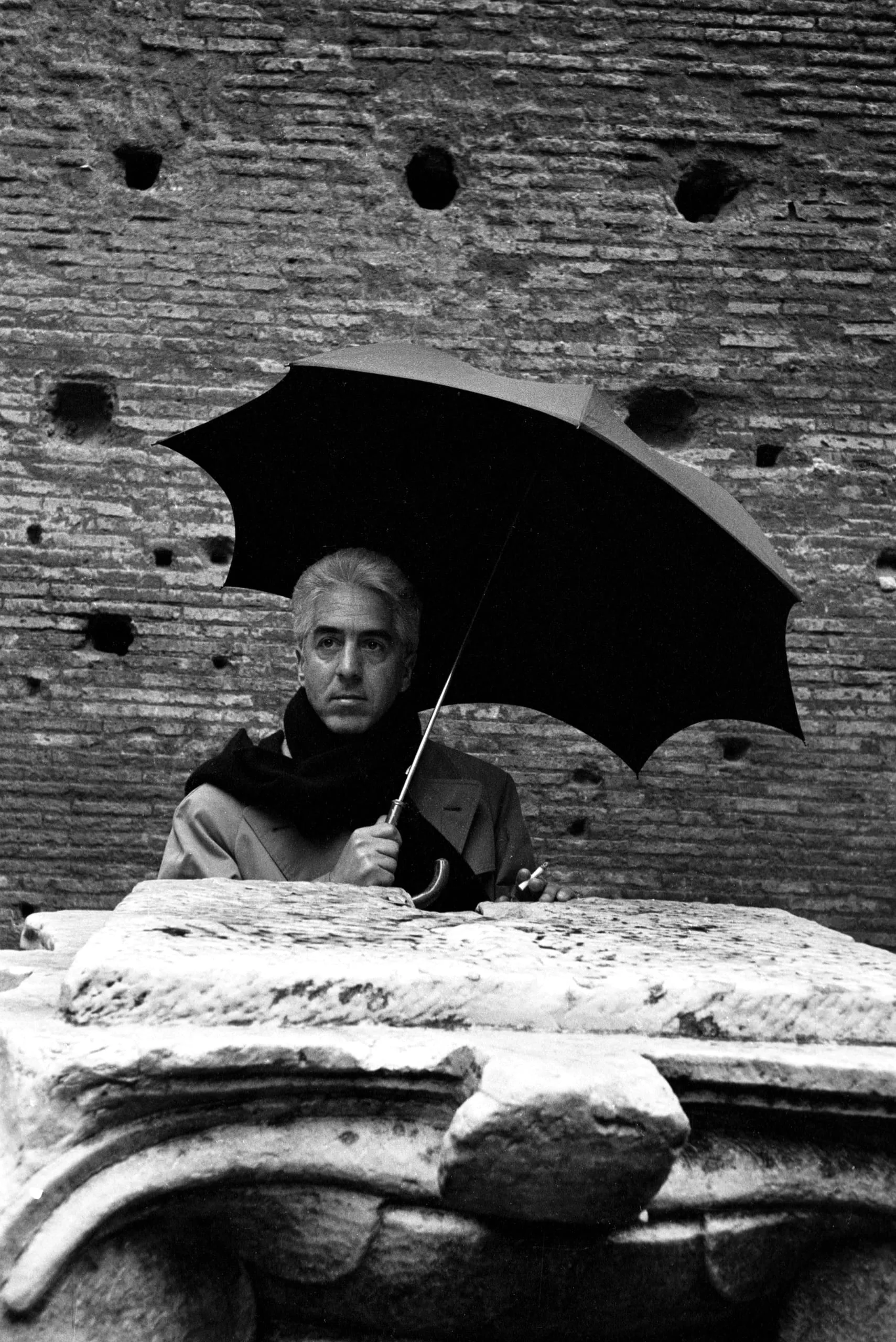 Black and white photograph of a man holding an open black umbrella, partially obscured by a carved stone architectural fragment, against an ancient brick wall with circular holes