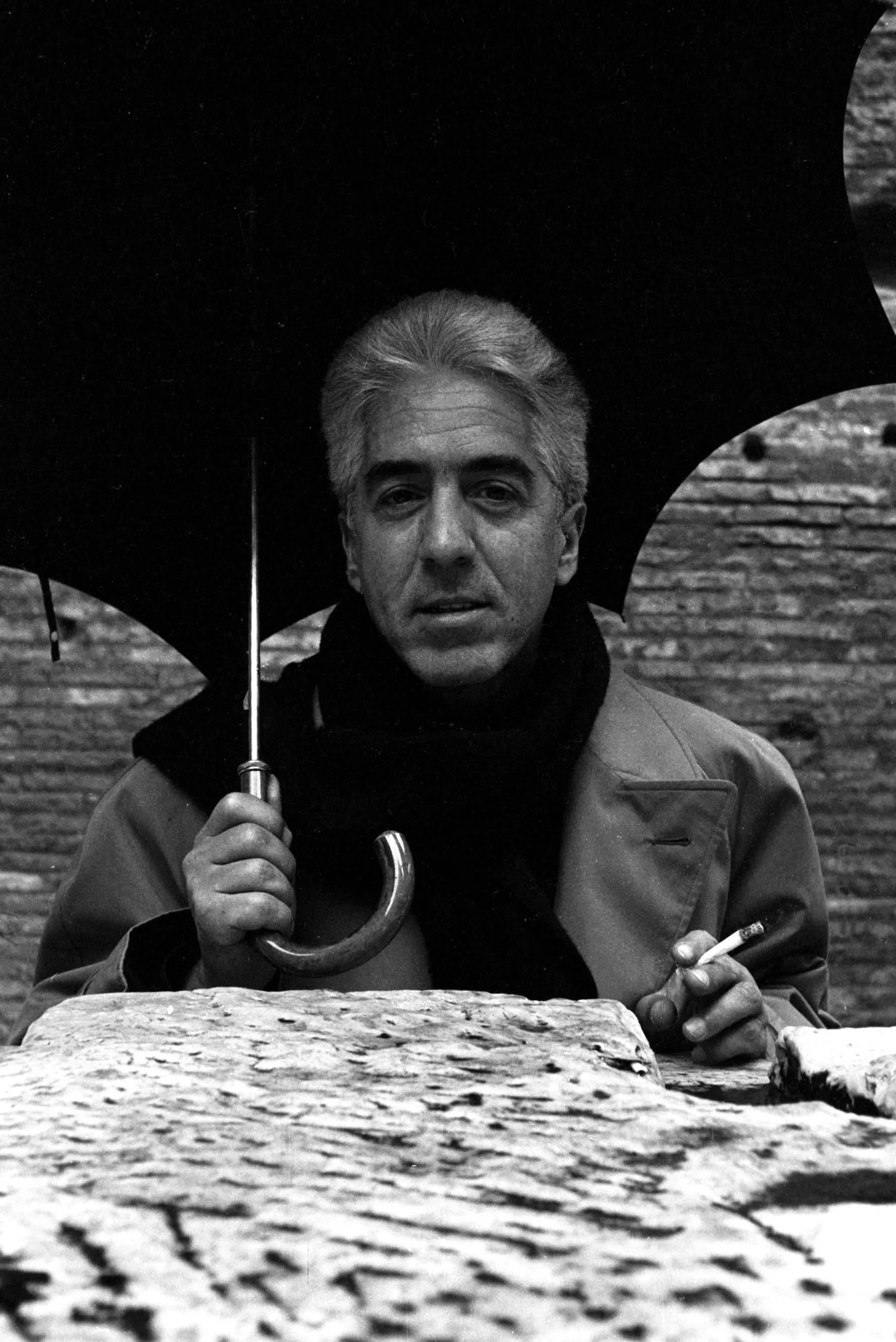 Black and white photograph, man shown from the chest up behind a stone ledge, holding an open umbrella and a cigarette, looking directly at the camera