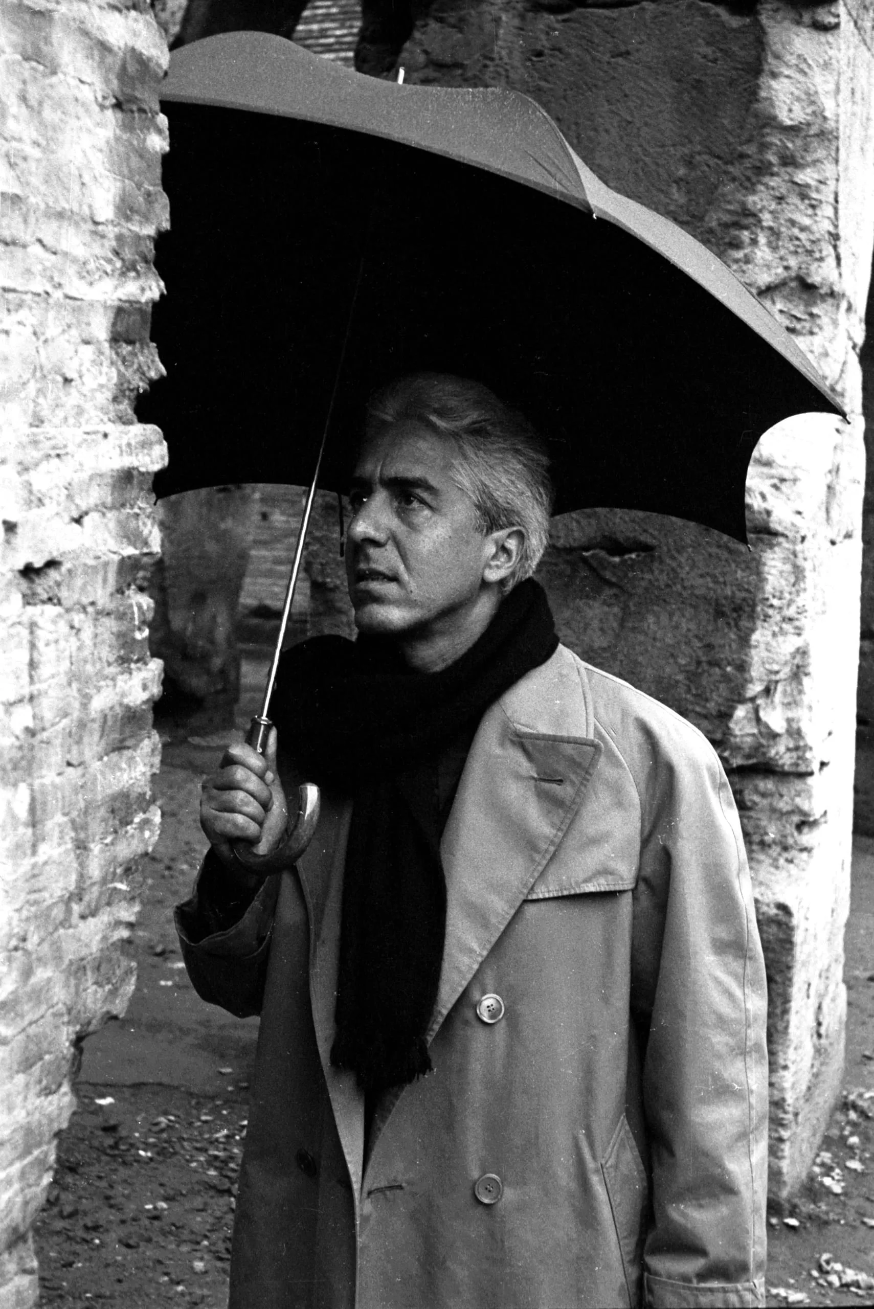 Black and white photograph of a man in a trench coat and dark scarf holding an umbrella, looking upward between two weathered stone walls