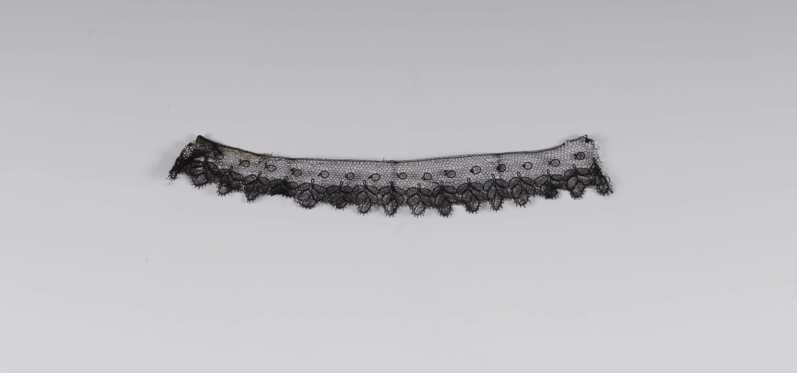 Strip of narrow black lace with open mesh ground, a row of circular motifs along the upper edge, and a scalloped lower border of repeated leaf and floral shapes