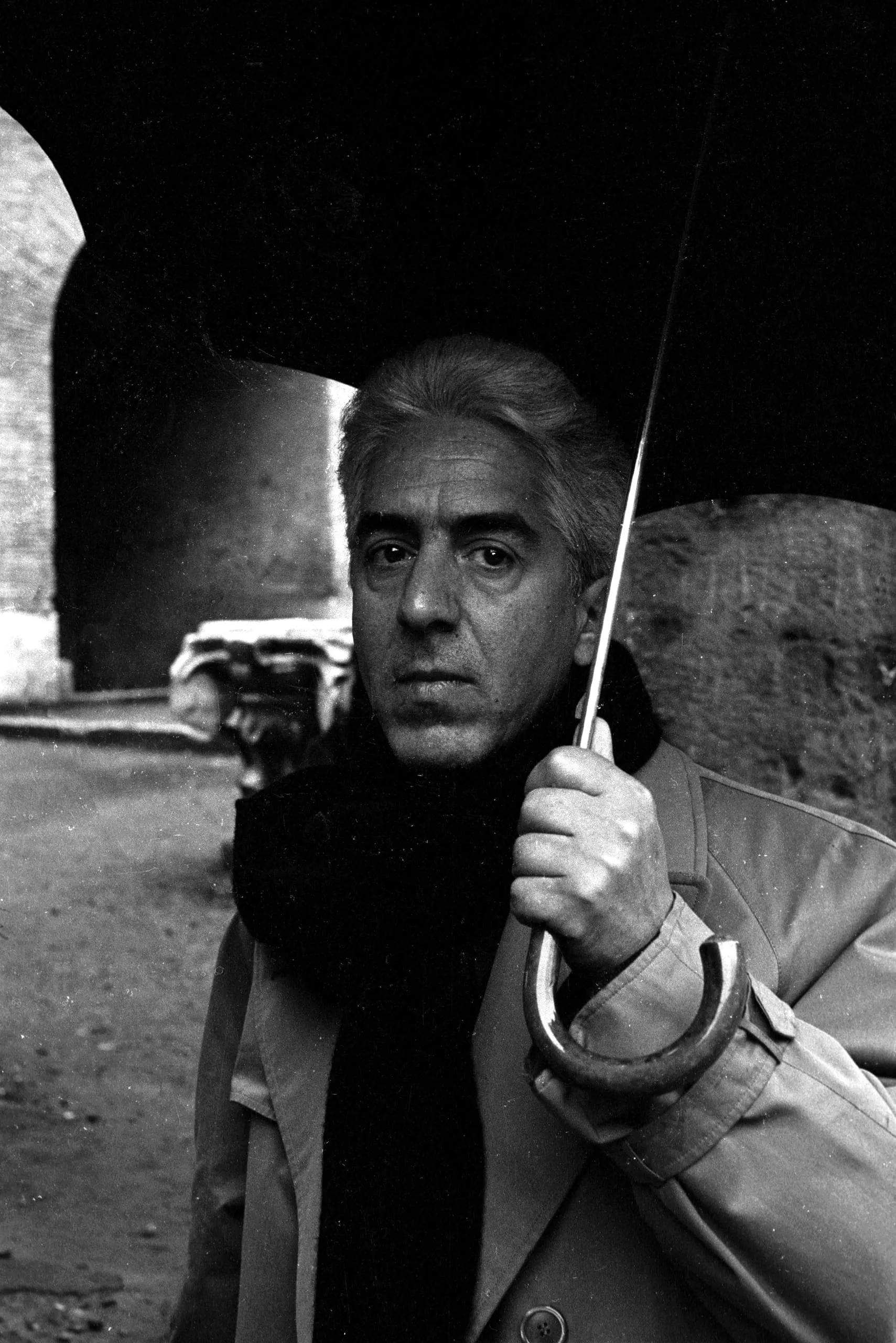 Black and white portrait photograph, man from the chest up holding a dark umbrella low over his head, wearing a trench coat and dark scarf, with weathered stone architecture behind him
