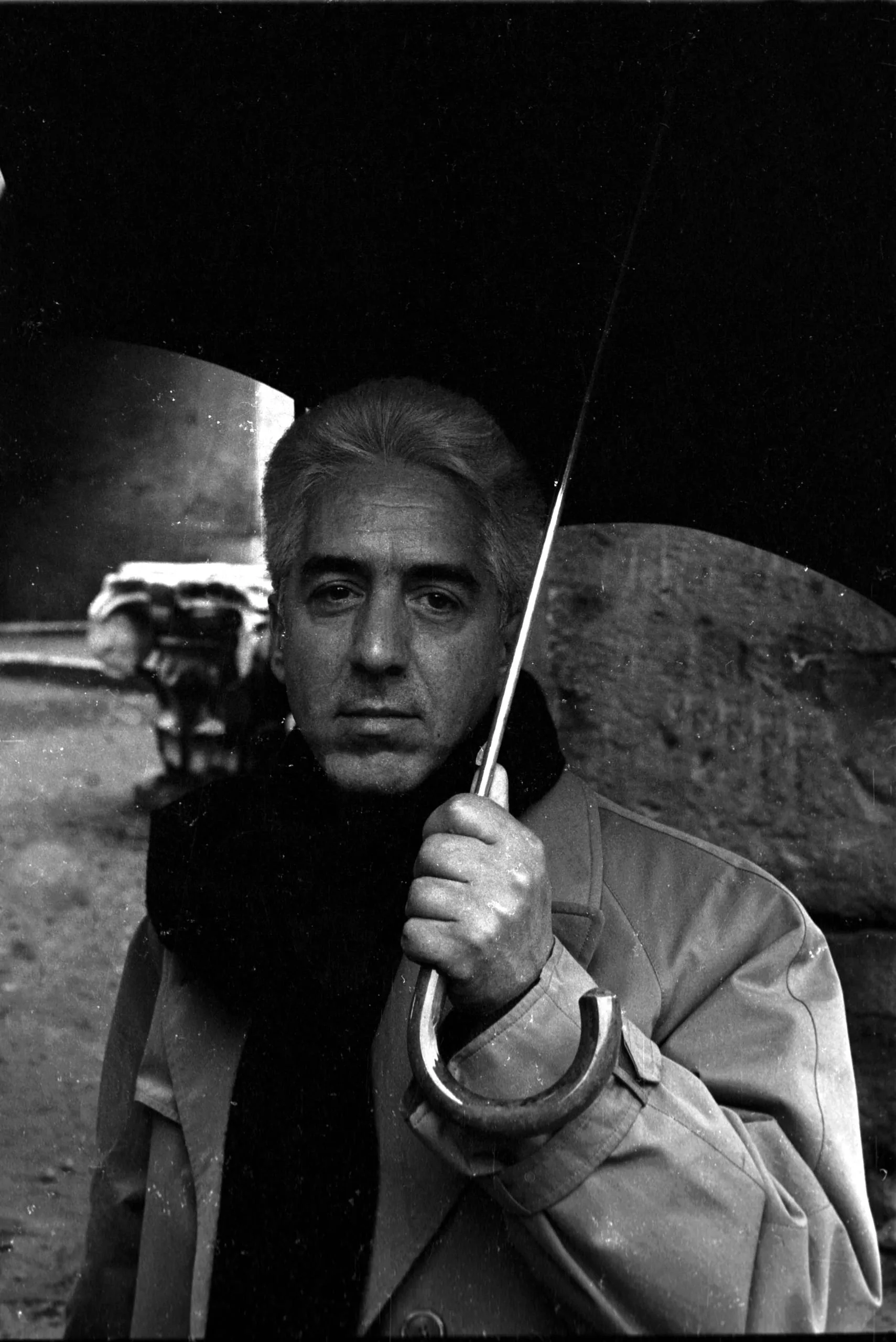 Black and white portrait photograph, a gray-haired man in a trench coat looks directly at camera while holding an open umbrella, soft diffused light