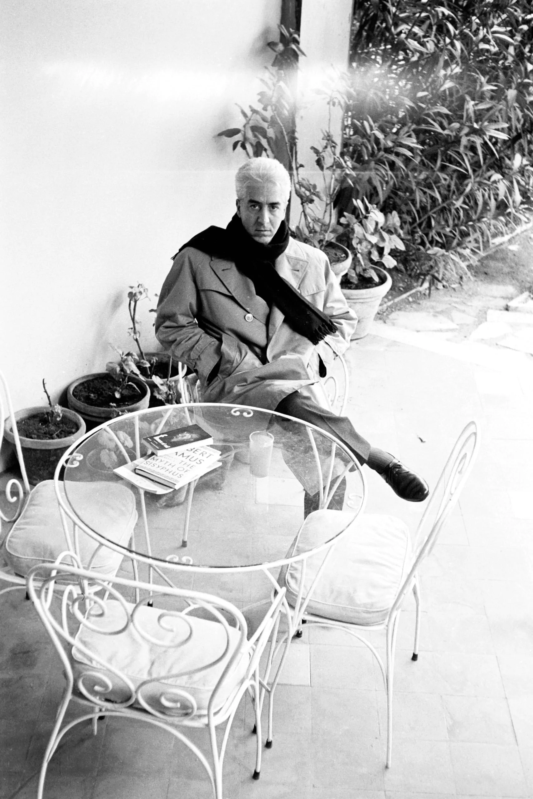 Black and white photograph of a white-haired man in a trench coat and dark scarf seated at a round glass garden table, looking directly at the camera