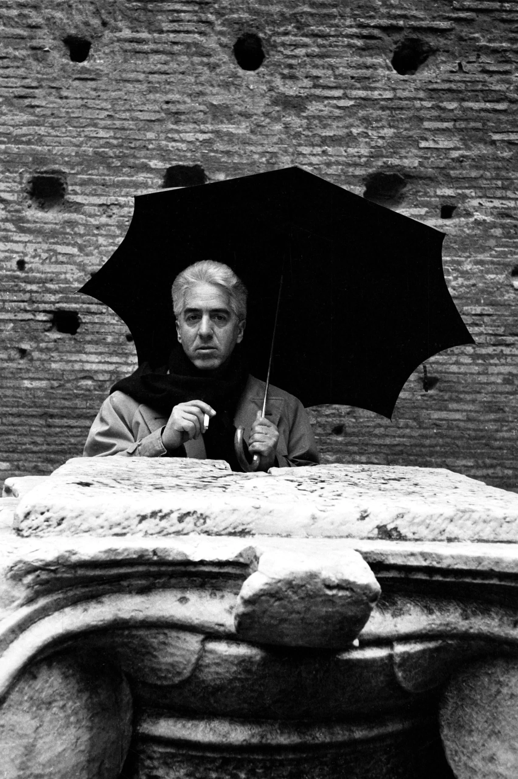 Black and white portrait photograph, a gray-haired man holds an open black umbrella and a cigarette behind a weathered stone column capital, aged brick wall with square openings behind him